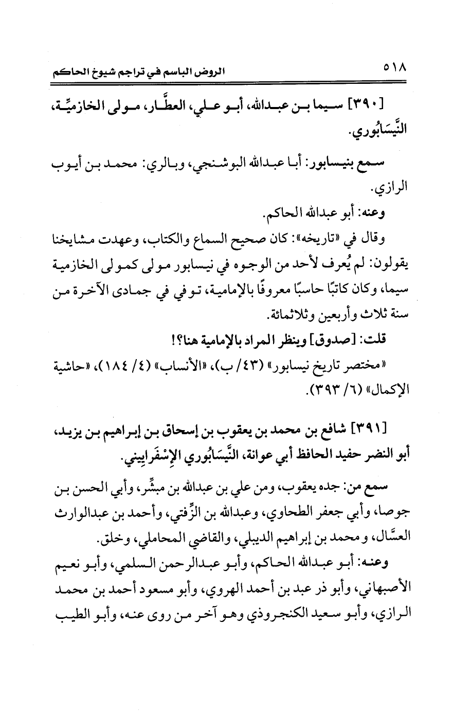 "مختصر تاريخ نيسابور" (43/ ب)، "الأنساب" (4/ 184)، "حاشية الإكمال" (6/ 393).