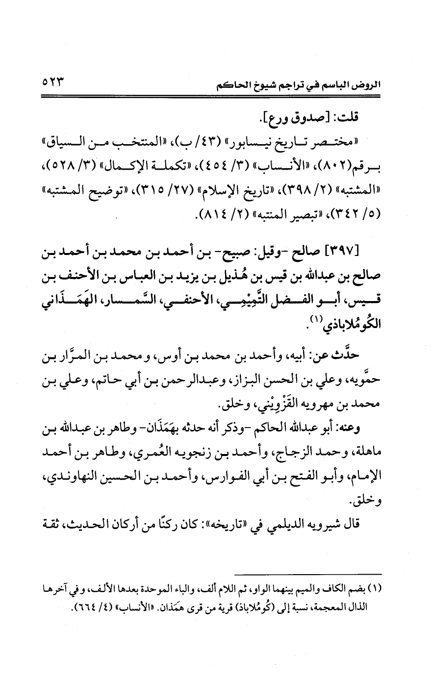 (¬1) بضم الكاف والميم بينهما الواو، ثم اللام ألف، والباء الموحدة بعدها الألف، وفي آخرها الذال المعجمة، نسبة إلى (كُومُلاباذ) قرية من قرى هَمَذان. "الأنساب" (4/ 664).