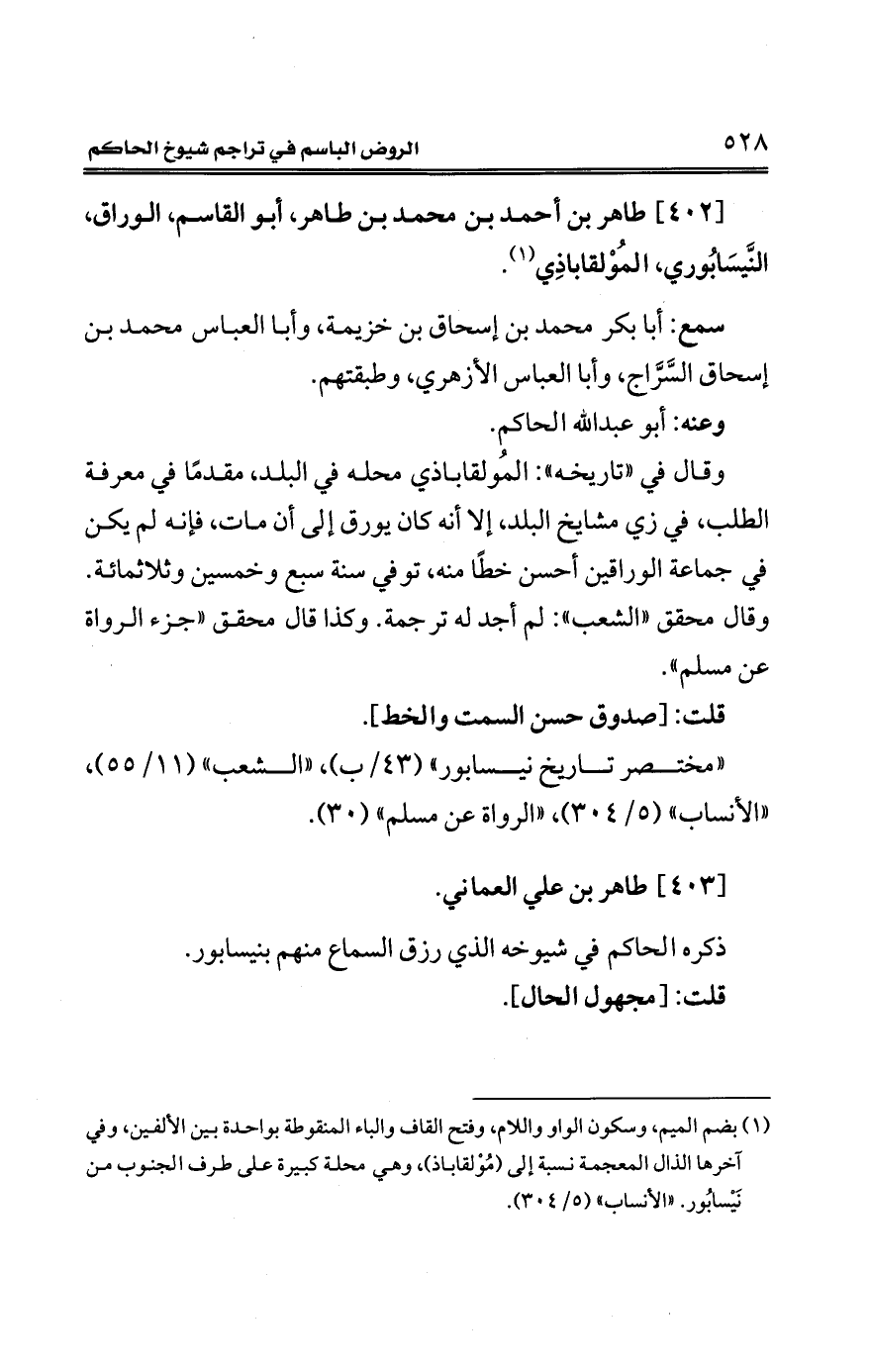 (¬1) بضم الميم، وسكون الواو واللام، وفتح القاف والباء المنقوطة بواحدة بِن الألفين، وفي آخرها الذال المعجمة نسبة إلى (مُوْلقاباذ)، وهي محلة كبيرة على طرف الجنوب من نَيْسابُور. "الأنساب" (5/ 304).