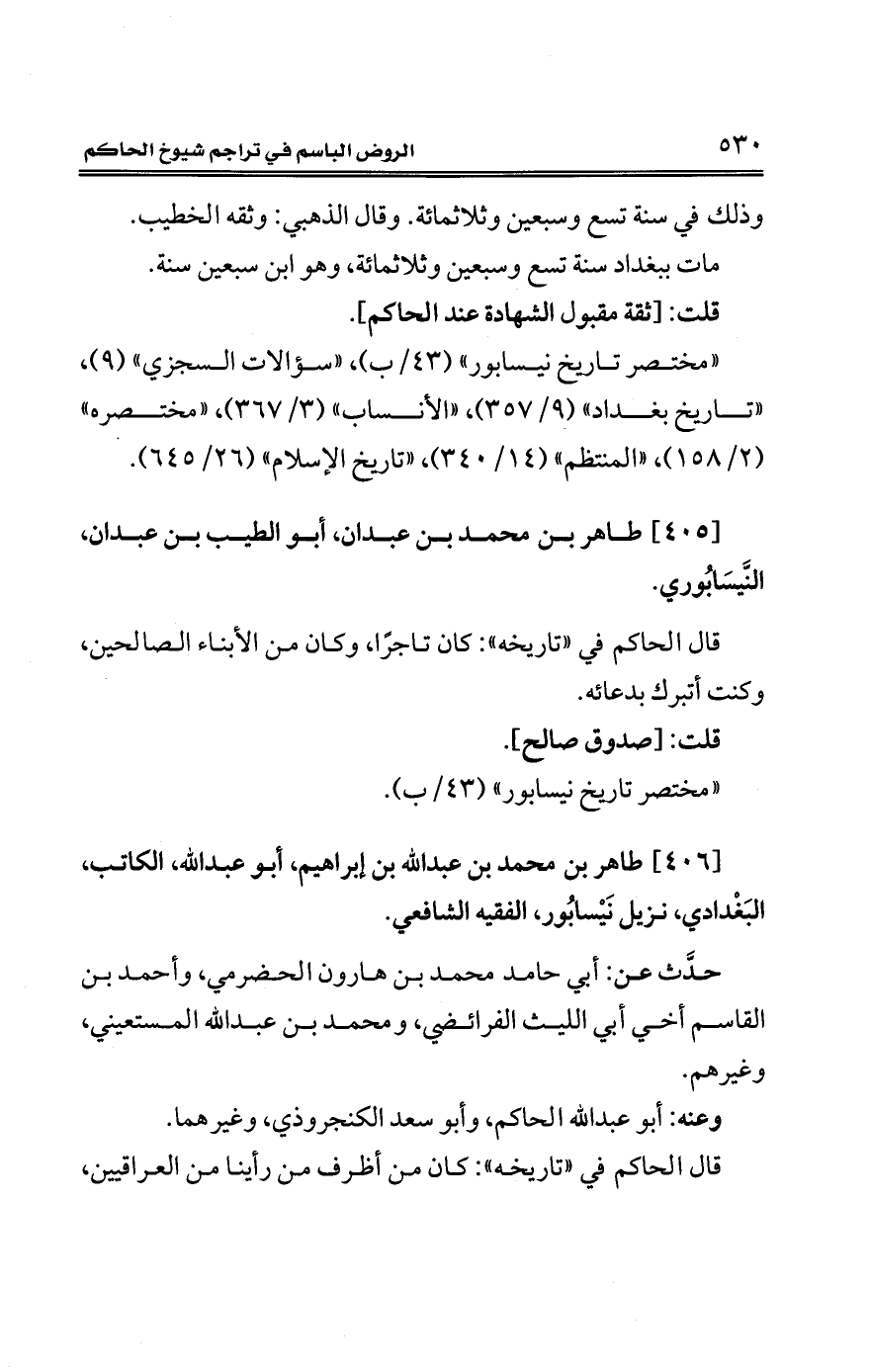 [406] طاهر بن محمد بن عبد الله بن إبراهيم، أبو عبد الله، الكاتب، البَغْدادي، نزيل نَيْسابُور، الفقيه الشافعي.