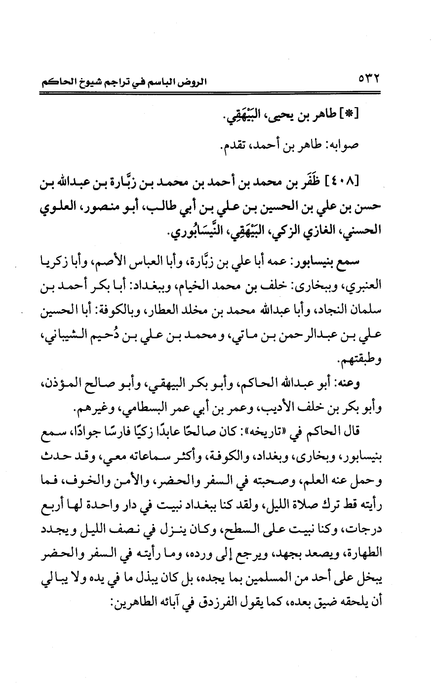 [408] ظَفَر بن محمد بن أحمد بن محمد بن زبَّارة بن عبد الله بن حسن بن علي بن الحسين بن علي بن أبي طالب، أبو منصور، العلوي الحسني، الغازي الزكي، البَيْهَقِي، النَّيسَابُوري.
