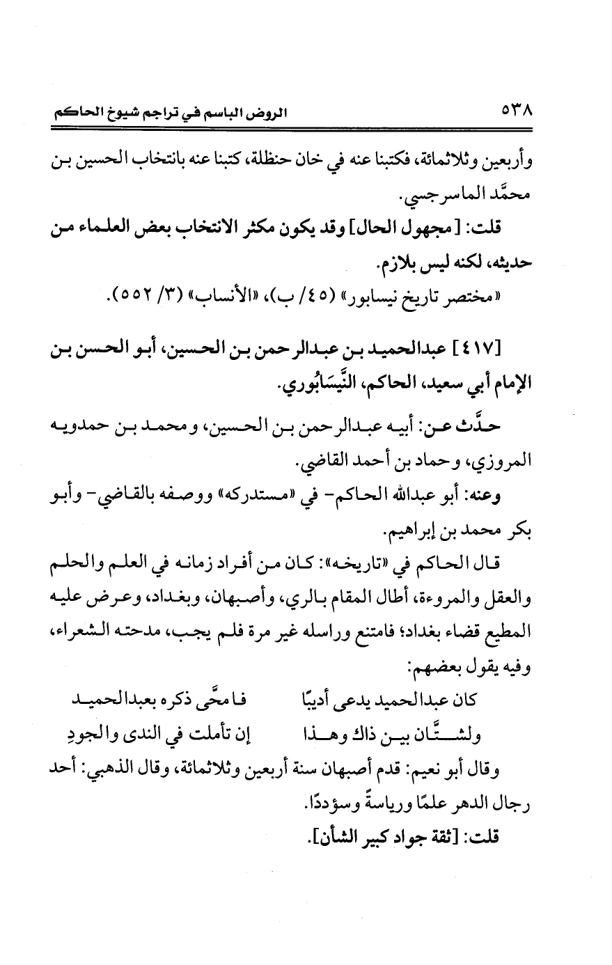 [417] عبد الحميد بن عبد الرحمن بن الحسين، أبو الحسن بن الإمام أبي سعيد، الحاكم، النَّيسَابُوري.