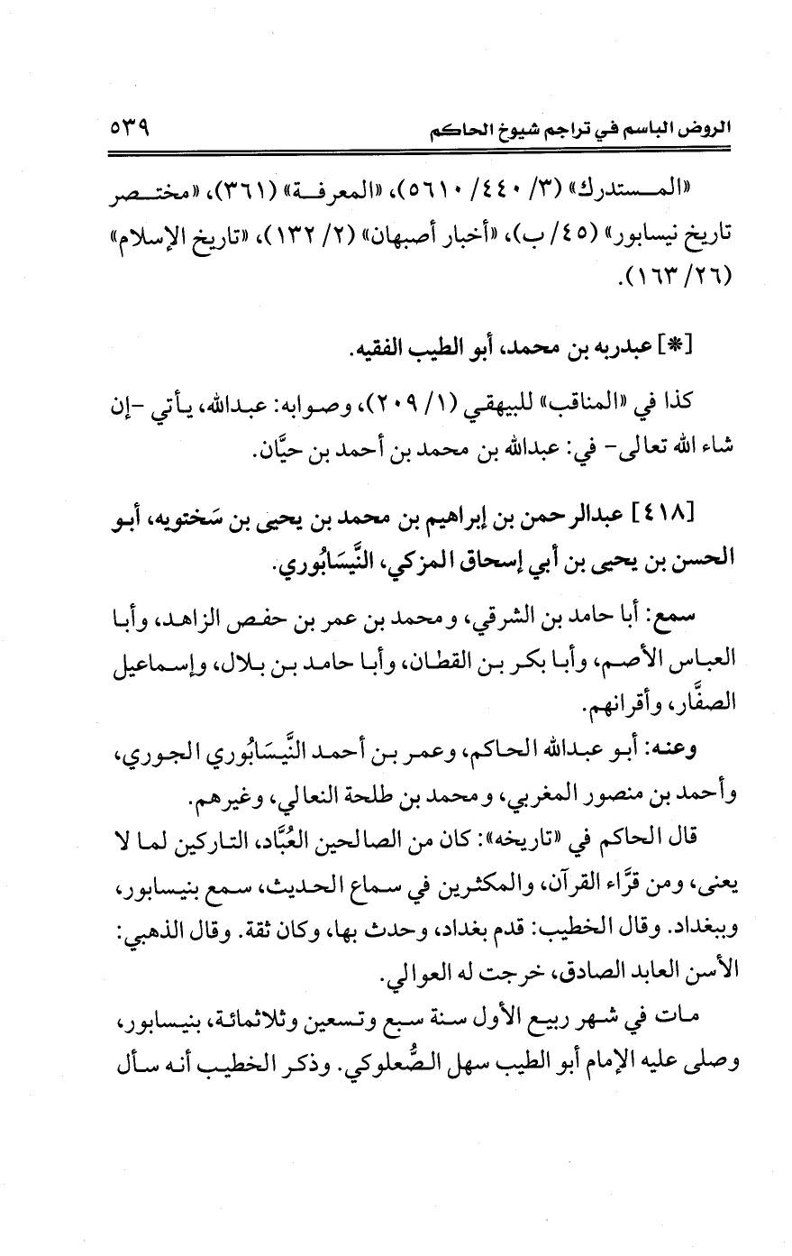 [418] عبد الرحمن بن إبراهيم بن محمد بن يحيى بن سَختويه، أبو الحسن بن يحيى بن أبي إسحاق المزكي، النَّيسَابُوري.