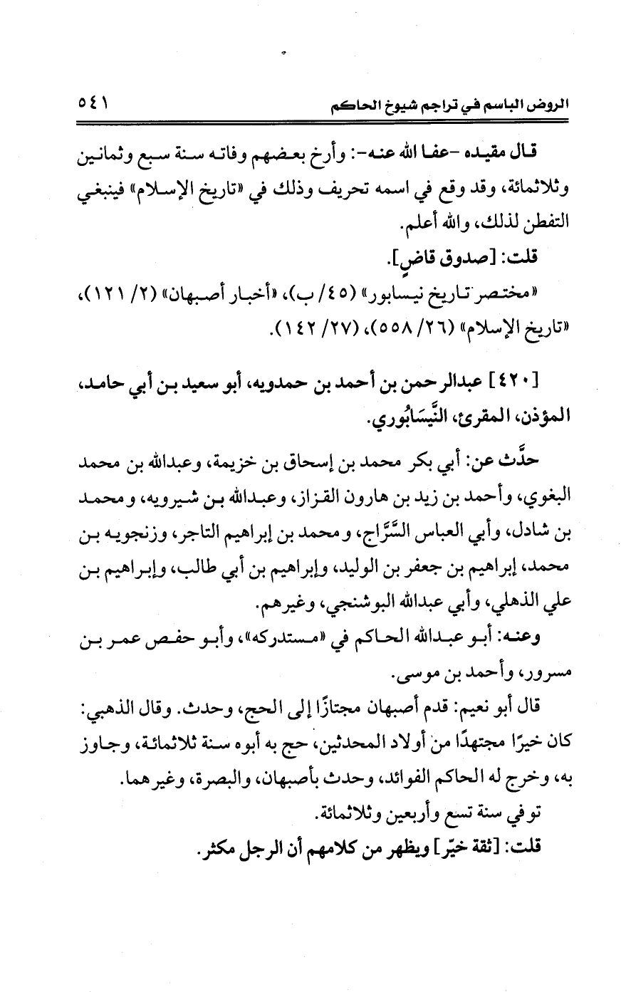 "مختصر تاريخ نيسابور" (45/ ب)، "أخبار أصبهان" (2/ 121)، "تاريخ الإسلام" (26/ 558)، (27/ 142).