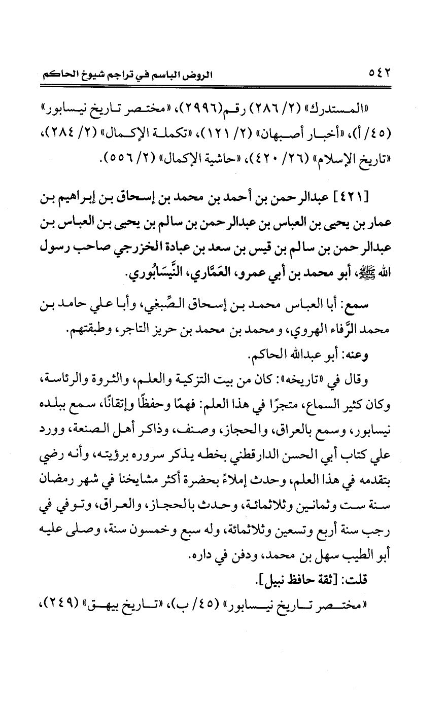[421] عبد الرحمن بن أحمد بن محمد بن إسحاق بن إبراهيم بن عمار بن يحيى بن العباس بن عبد الرحمن بن سالم بن يحيى بن العباس بن عبد الرحمن بن سالم بن قيس بن سعد بن عبادة الخزرجي صاحب رسول الله - صلى الله عليه وسلم -، أبو محمد بن أبي عمرو، العَمَّاري، النَّيسَابُوري.