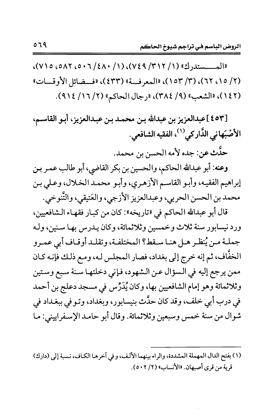 [453] عبد العزيز بن عبد الله بن محمد بن عبد العزيز، أبو القاسم، الأصْبَهانى الدَّاركي (¬1)، الفقيه الشافعي.