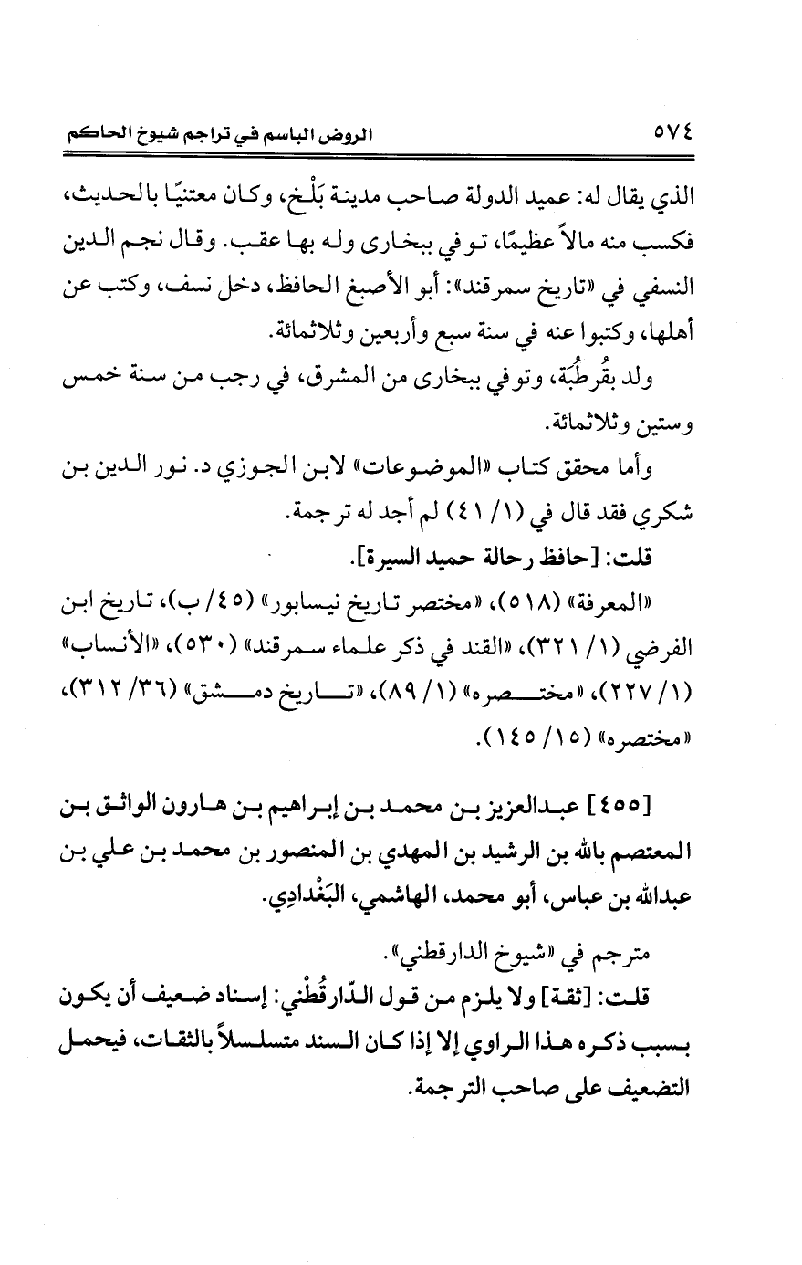 [455] عبد العزيز بن محمد بن إبراهيم بن هارون الواثق بن المعتصم بالله بن الرشيد بن المهدي بن المنصور بن محمد بن علي بن عبد الله بن عباس، أبو محمد، الهاشمي، البَغْدادِي.