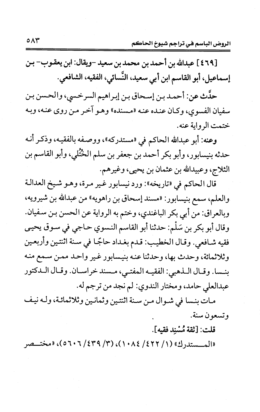 [469] عبد الله بن أحمد بن محمد بن سعيد -وبقال: ابن يعقوب- بن إسماعيل، أبو القاسم ابن أبي سعيد، النَّسائي، الفقيه، الشافعي.