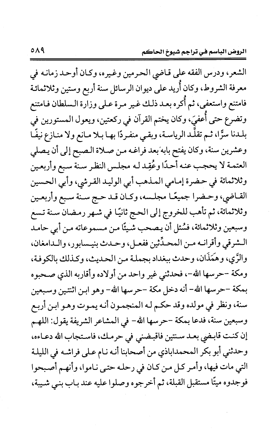 الشعر، ودرس الفقه على قاضي الحرمين وغيره، وكان أوحد زمانه في معرفة الشروط، وكان أُريد على ديوان الرسائل سنة أربع وستين وثلاثمائة فامتنع واستعفى، ثم أُكره بعد ذلك غير مرة على وزارة السلطان فامتنع وتضرع حتى أُعفيَ، وكان يختم القرآن في ركعتين، ويعول المستورين في بلدنا سرًّا، ثم تقلَّد الرياسة، وبقي منفردًا بها بلا مانع ولا منازع نيفًا وعشرين سنة، وكان يفتح بابه بعد فراغه من صلاة الصبح إلى أن يصلي العتمة لا يحجب عنه أحدًا وعُقِد له مجلس النظر سنة سبع وأربعين وثلاثمائة في حضرة إمامي المذهب أبي الوليد القرشي، وأبي الحسين القاضي، وحضرا جميعًا مجلسه، وكان قد حج سنة سبع وأربعين وثلاثمائة، ثم تأهب للخروج إلى الحج ثانيًا في شهر رمضان سنة تسع وسبعين وثلاثمائة، فسُئل أن يصحب شيئًا من مسموعاته من أبي حامد الشرقي وأقرانه من المحدِّثين ففعل، وحدث بنيسابور، والدامغان، والرَّي، وهَمَذَان، وحدث ببغداد بجملة من الحديث، وكذلك بالكوفة، ومكة -حرسها الله-، فحدثني غير واحد من أولاده وأقاربه الذي صحبوه بمكة -حرسها الله- أنه دخل مكة -حرسها الله-وهو ابن اثنتين وسبعين سنة، ونظر في مولده وقد حكم له المنجمون أنه يموت وهو ابن أربع وسبعين سنة، فدعا بمكة -حرسها الله- في المشاعر الشريفة يقول: اللهم إن كنت قابضي بعد سنتين فاقبضني في حرمك، فاستجاب الله دعاءه، وحدثني أبو بكر المحمداباذي من أصحابنا أنه نام على فراشه في الليلة التي مات فيها، وأمر كل من كان في رحله حتى ناموا، وأنهم أصبحوا فوجدوه ميتًا مستقبل القبلة، ثم أخرجوه وصلوا عليه عند باب بني شيبة،