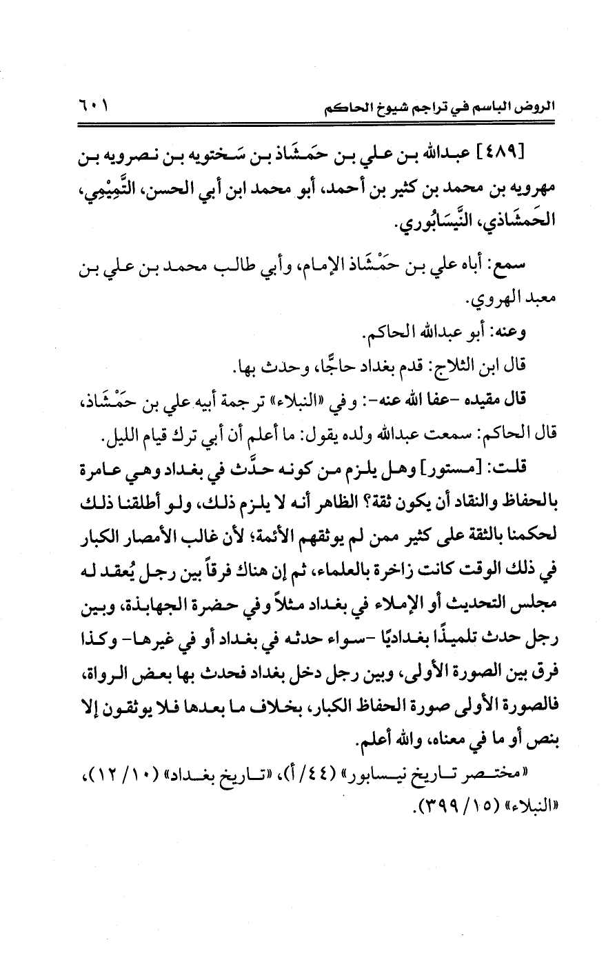 "مختصر تاريخ نيسابور" (44/ أ)، "تاريخ بغداد" (10/ 12)، "النبلاء" (15/ 399).