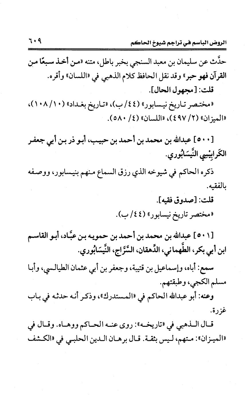 "مختصر تاريخ نيسابور" (44/ ب)، "تاريخ بغداد" (10/ 108)، "الميزان" (2/ 497)،"اللسان" (4/ 580).
