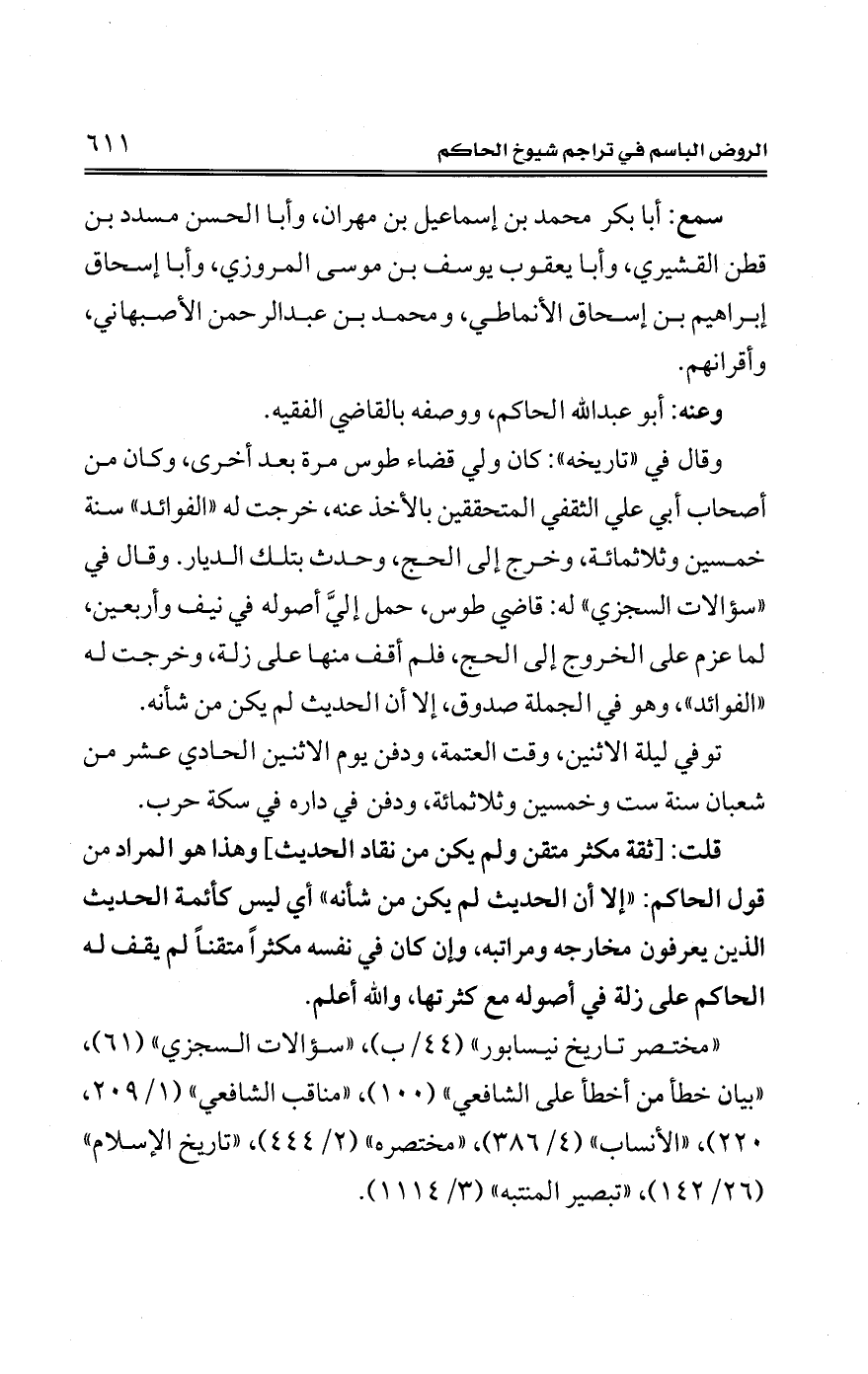 قلت: [ثقة مكثر متقن ولم يكن من نقاد الحديث] وهذا هو المراد من قول الحاكم: "إلا أن الحديث لم يكن من شأنه" أي ليس كأئمة الحديث الذين يعرفون مخارجه ومراتبه، وإن كان في نفسه مكثرًا متقنًا لم يقف له الحاكم على زلة في أصوله مع كثرتها، والله أعلم.