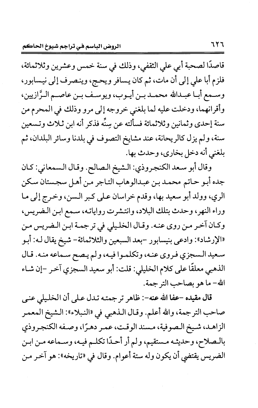 قال مقيده -عفا الله عنه-: ظاهر ترجمته تدل على أن الخليلي عني صاحب الترجمة، والله أعلم. وقال الذهبي في "النبلاء": الشيخ المعمر الزاهد، شيخ الصوفية، مسند الوقت، عمر دهرًا، وصفه الكنجروذي بالصلاح، وحديثه مستقيم، ولم أر أحدًا تكلم فيه، وسماعه من ابن الضريس يقتضي أن يكون وله ستة أعوام. وقال في "تاريخه": هو آخر من