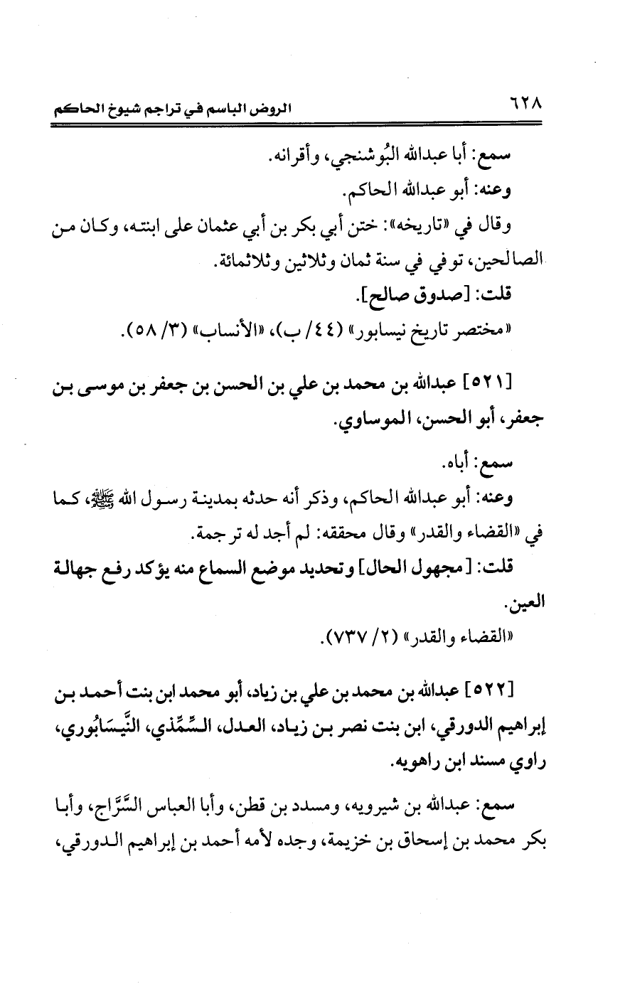 [522] عبد الله بن محمَّد بن علي بن زياد، أبو محمَّد ابن بنت أحمد بن إبراهيم الدورقي، ابن بنت نصر بن زياد، العدل، السِّمِّذي، النَّيسَابُوري، راوي مسند ابن راهويه.