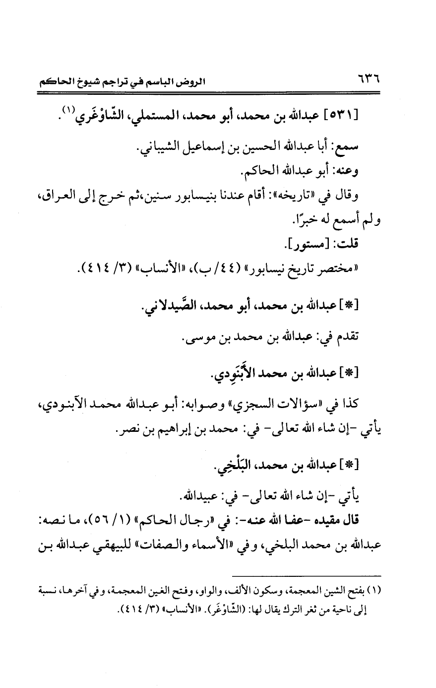 قال مقيده -عفا الله عنه-: في "رجال الحاكم" (1/ 56)، ما نصه: عبد الله بن محمَّد البلخي، وفي "الأسماء والصفات" للبيهقي عبد الله بن