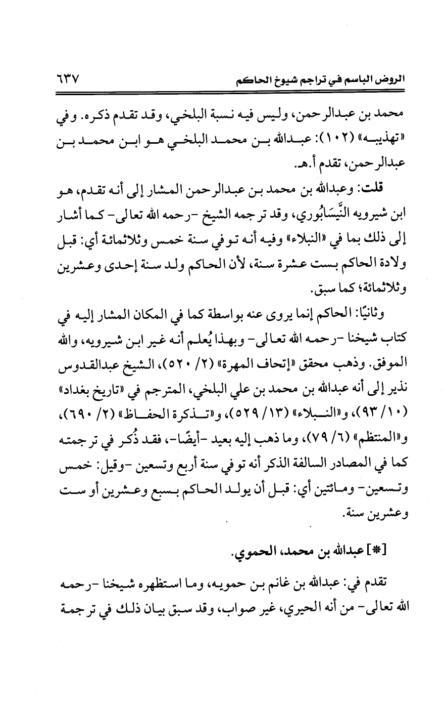 وثانيًا: الحاكم إنما يروى عنه بواسطة كما في المكان المشار إليه في كتاب شيخنا -رحمه الله تعالي- وبهذا يُعلم أنه غير ابن شيرويه، والله الموفق. وذهب محقق "إتحاف المهرة" (2/ 520)، الشيخ عبد القدوس نذير إلى أنه عبد الله بن محمَّد بن علي البلخي، المترجم في "تاريخ بغداد" (10/ 93)، و"النبلاء" (13/ 529)، و"تذكرة الحفاظ" (2/ 690)، و"المنتظم" (6/ 79)، وما ذهب إليه بعيد -أيضًا-، فقد ذُكر في ترجمته كما في المصادر السالفة الذكر أنه توفي سنة أربع وتسعين -وقيل: خمس وتسعين- ومائتين أي: قبل أن يولد الحاكم بسبع وعشرين أو ست وعشرين سنة.