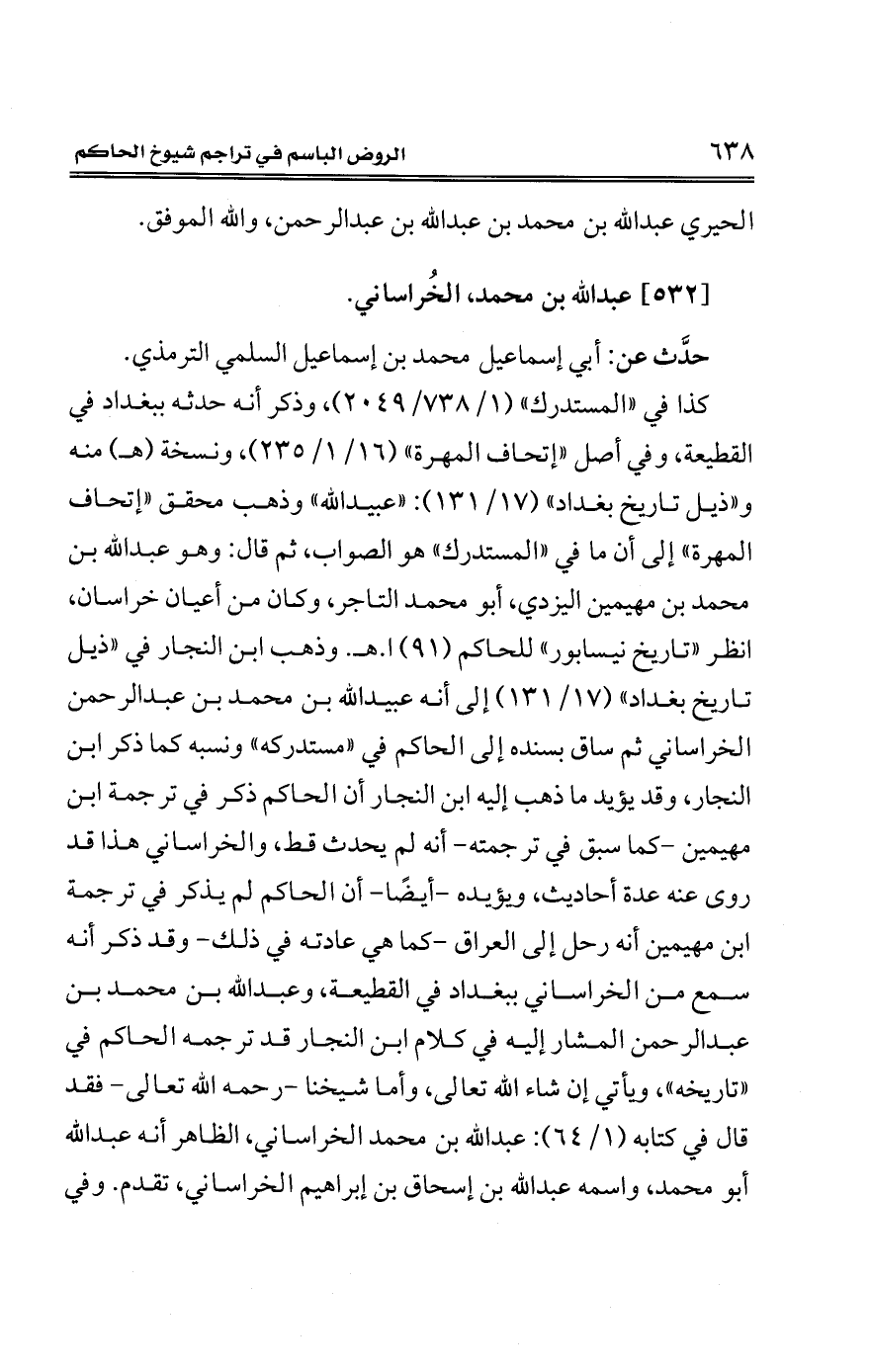 كذا في "المستدرك" (1/ 738/ 2049)، وذكر أنه حدثه ببغداد في القطيعة، وفي أصل "إتحاف المهرة" (16/ 1/ 235)، ونسخة (هـ) منه و"ذيل تاريخ بغداد" (17/ 131): "عبيد الله" وذهب محقق "إتحاف المهرة" إلى أن ما في "المستدرك" هو الصواب، ثم قال: وهو عبد الله بن محمَّد بن مهيمين اليزدي، أبو محمَّد التاجر، وكان من أعيان خراسان، انظر "تاريخ نيسابور" للحاكم (91) ا. هـ. وذهب ابن النجار في "ذيل تاريخ بغداد" (17/ 131) إلى أنه عبيد الله بن محمَّد بن عبد الرحمن الخراساني ثم ساق بسنده إلى الحاكم في "مستدركه" ونسبه كما ذكر ابن النجار، وقد يؤيد ما ذهب إليه ابن النجار أن الحاكم ذكر في ترجمة ابن مهيمين -كما سبق في ترجمته- أنه لم يحدث قط، والخراساني هذا قد روى عنه عدة أحاديث، ويؤيده -أيضًا- أن الحاكم لم يذكر في ترجمة ابن مهيمين أنه رحل إلى العراق -كما هي عادته في ذلك- وقد ذكر أنه سمع من الخراساني ببغداد في القطيعة، وعبد الله بن محمَّد بن عبد الرحمن المشار إليه في كلام ابن النجار قد ترجمه الحاكم في "تاريخه"، ويأتي إن شاء الله تعالي، وأما شيخنا -رحمه الله تعالي- فقد قال في كتابه (1/ 64): عبد الله بن محمَّد الخراساني، الظاهر أنه عبد الله أبو محمَّد، واسمه عبد الله بن إسحاق بن إبراهيم الخراساني، تقدم. وفي