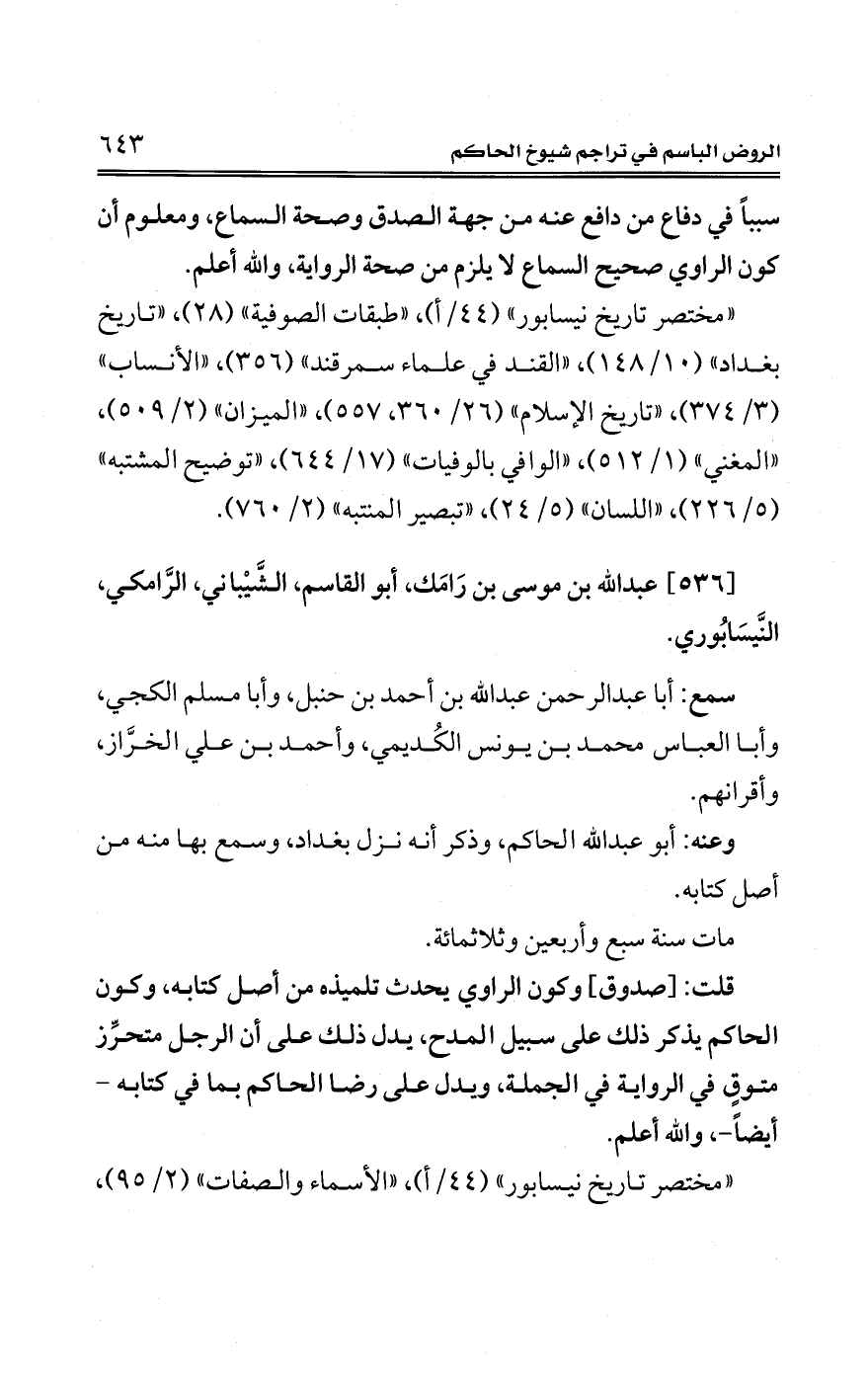 قلت: [صدوق] وكون الراوي يحدث تلميذه من أصل كتابه، وكون الحاكم يذكر ذلك على سبيل المدح، يدل ذلك على أن الرجل متحرِّز متوقٍ في الرواية في الجملة، ويدل على رضا الحاكم بما في كتابه -أيضًا-، والله أعلم.