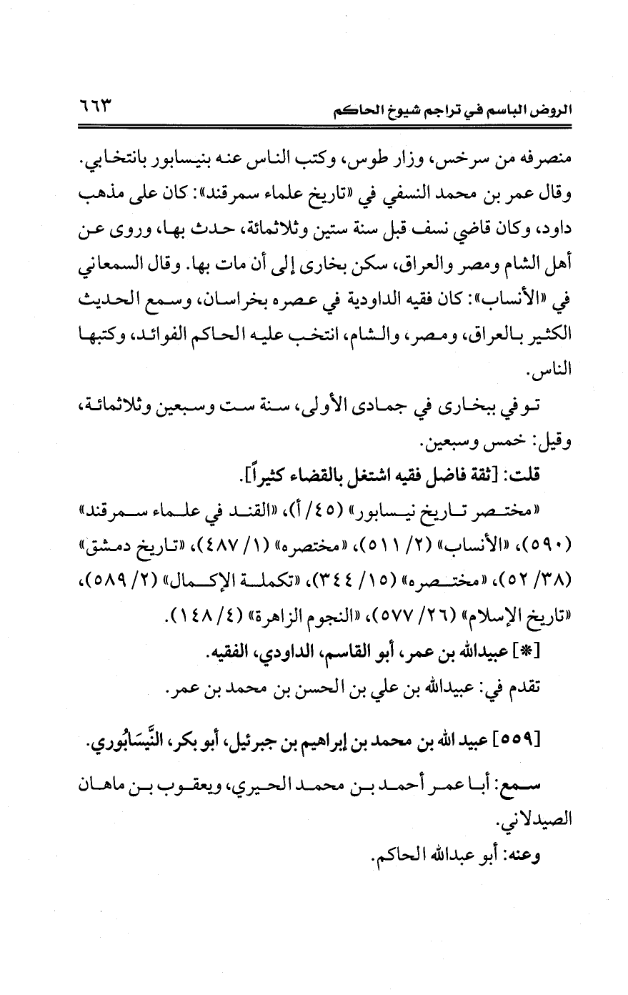 "مختصر تاريخ نيسابور" (45/ أ)، "القند في علماء سمرقند" (590)، "الأنساب" (2/ 511)، "مختصره" (1/ 487)، "تاريخ دمشق" (38/ 52)، "مختصره" (15/ 344)، "تكملة الإكمال" (2/ 589)، "تاريخ الإِسلام" (26/ 577)، "النجوم الزاهرة" (4/ 148).