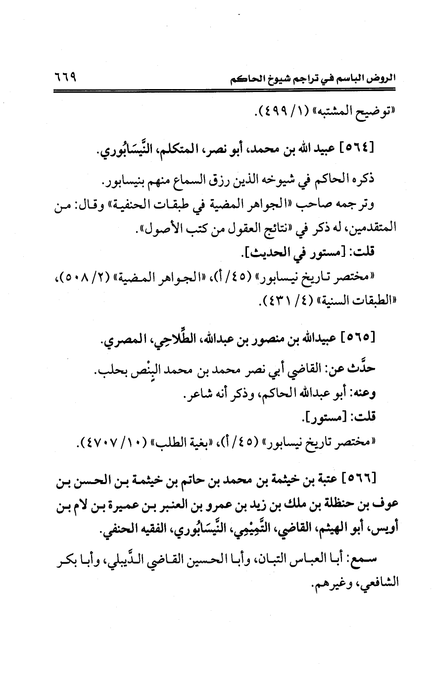 "مختصر تاريخ نيسابور" (45/ أ)، "الجواهر المضية" (2/ 508)، "الطبقات السنية" (4/ 431).