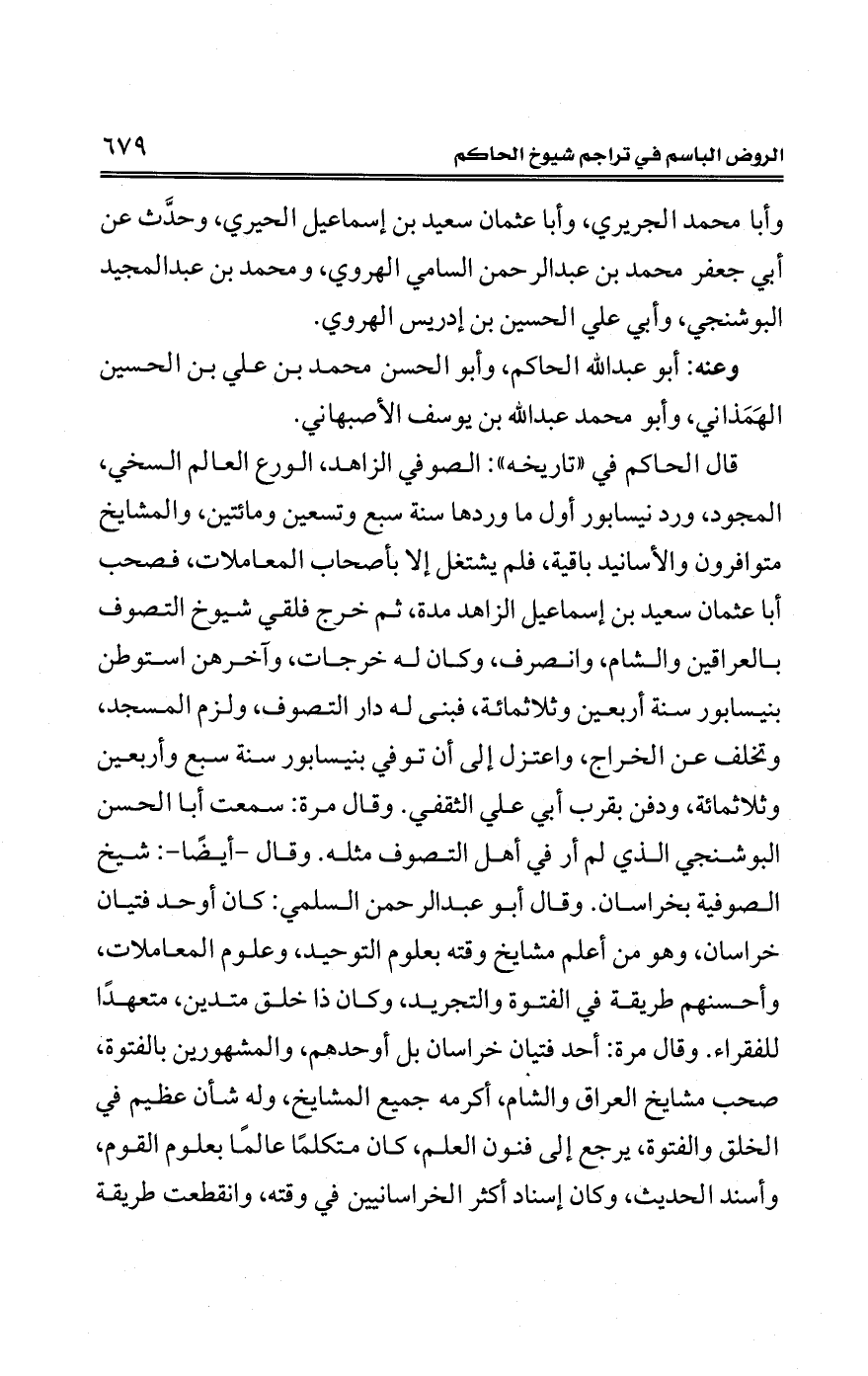 قال الحاكم في "تاريخه": الصوفي الزاهد، الورع العالم السخي، المجود، ورد نيسابور أول ما وردها سنة سبع وتسعين ومائتين، والمشايخ متوافرون والأسانيد باقية، فلم يشتغل إلا بأصحاب المعاملات، فصحب أبا عثمان سعيد بن إسماعيل الزاهد مدة، ثم خرج فلقي شيوخ التصوف بالعراقين والشام، وانصرف، وكان له خرجات، وآخرهن استوطن بنيسابور سنة أربعين وثلاثمائة، فبنى له دار التصوف، ولزم المسجد، وتخلف عن الخراج، واعتزل إلى أن توفي بنيسابور سنة سبع وأربعين وثلاثمائة، ودفن بقرب أبي علي الثقفي. وقال مرة: سمعت أبا الحسن البوشنجي الذي لم أر في أهل التصوف مثله. وقال -أيضًا-: شيخ الصوفية بخراسان. وقال أبو عبد الرحمن السلمي: كان أوحد فتيان خراسان، وهو من أعلم مشايخ وقته بعلوم التوحيد، وعلوم المعاملات، وأحسنهم طريقة في الفتوة والتجريد، وكان ذا خلق متدين، متعهدًا للفقراء. وقال مرة: أحد فتيان خراسان بل أوحدهم، والمشهورين بالفتوة، صحب مشايخ العراق والشام، أكرمه جميع المشايخ، وله شأن عظيم في الخلق والفتوة، يرجع إلى فنون العلم، كان متكلمًا عالمًا بعلوم القوم، وأسند الحديث، وكان إسناد أكثر الخراسانيين في وقته، وانقطعت طريقة