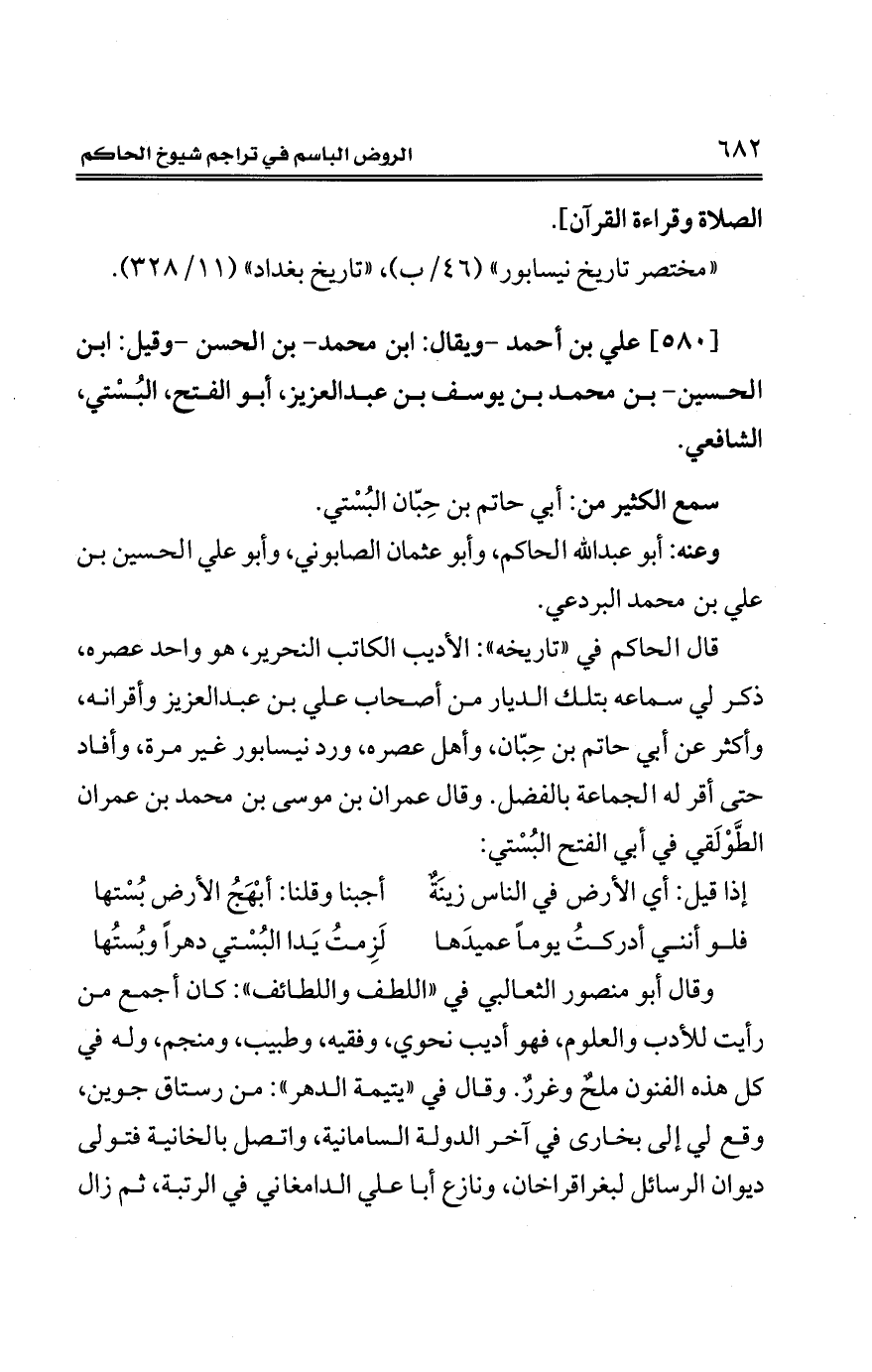 [580] علي بن أحمد -ويقال: ابن محمَّد- بن الحسن -وقيل: ابن الحسين- بن محمَّد بن يوسف بن عبد العزيز، أبو الفتح، البُسْتي، الشافعي.