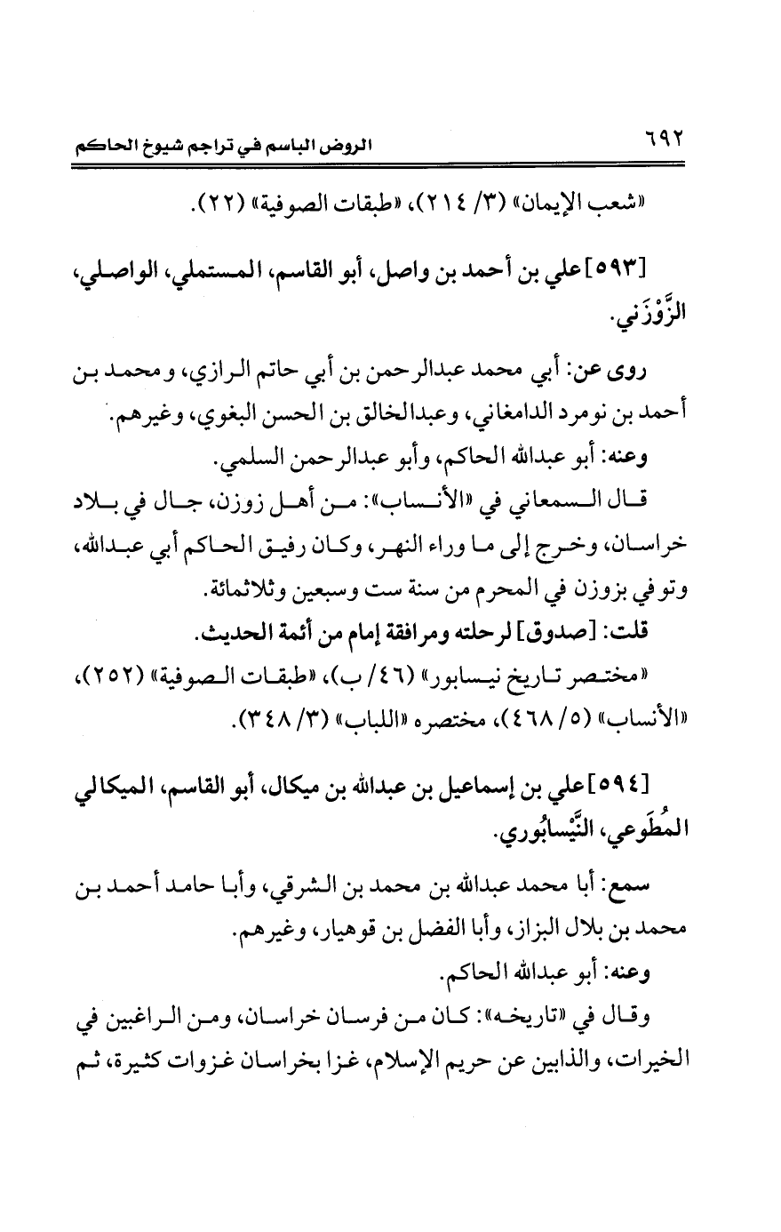 "مختصر تاريخ نيسابور" (46/ ب)، "طبقات الصوفية" (252)، "الأنساب" (5/ 468)، مختصره "اللباب" (3/ 348).