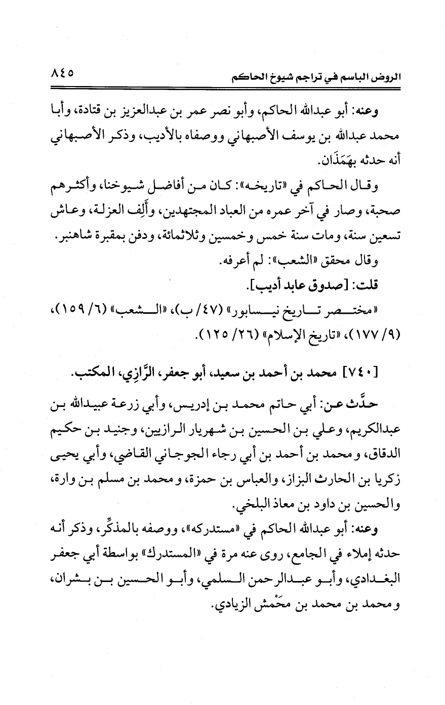 "مختصر تاريخ نيسابور" (47/ ب)، "الشعب" (6/ 159)، (9/ 177)، "تاريخ الإِسلام" (26/ 125)