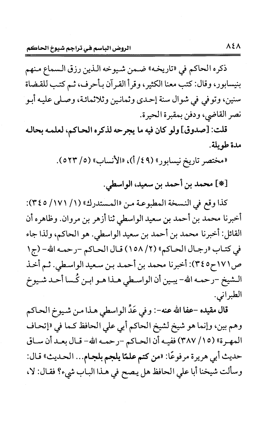 قال مقيده -عفا الله عنه-: وفي عَدِّ الواسطي هذا من شيوخ الحاكم وهم بين، وإنما هو شيخ لشيخ الحاكم أبي علي الحافظ كما في "إتحاف المهرة" (15/ 387) ففيه أن الحاكم -رحمه الله- قال بعد أن ساق حديث أبي هريرة مرفوعًا: "من كتم علمًا يلجم بلجام ... الحديث" قال: وسألت شيخنا أبا علي الحافظ هل يصح في هذا الباب شيء؟ فقال: لا،