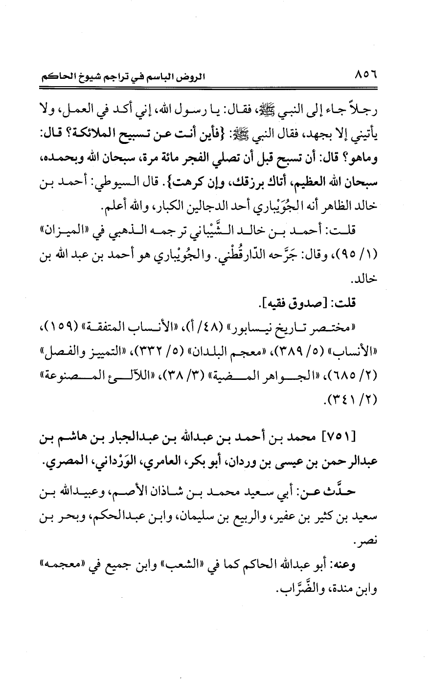 رجلًا جاء إلى النبي - صلى الله عليه وسلم -، فقال: يا رسول الله، إني أكد في العمل، ولا يأتيني إلا بجهد، فقال النبي - صلى الله عليه وسلم -: {فأين أنت عن تسبيح الملائكة؟ قال: وماهو؟ قال: أن تسبح قبل أن تصلي الفجر مائة مرة، سبحان الله وبحمده، سبحان الله العظيم، أتاك برزقك، وإن كرهت}. قال السيوطي: أحمد بن خالد الظاهر أنه الجُوَيْباري أحد الدجالين الكبار، والله أعلم.