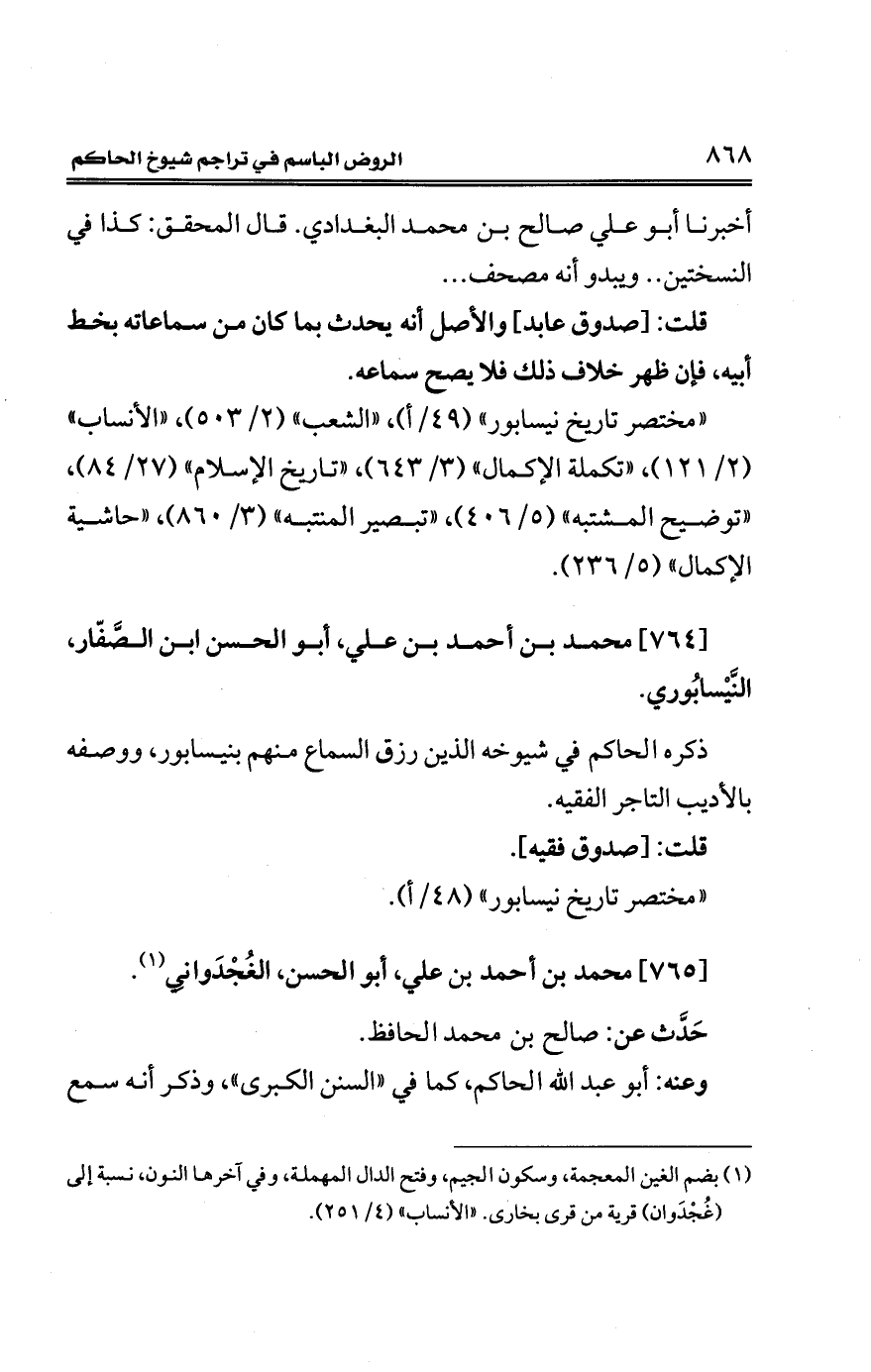 "مختصر تاريخ نيسابور" (49/ أ)، "الشعب" (2/ 503)، "الأنساب" (2/ 121)، "تكملة الإكمال" (3/ 643)، "تاريخ الإِسلام" (27/ 84)، "توضيح المشتبه" (5/ 406)، "تبصير المنتبه" (3/ 860)، "حاشية الإكمال" (5/ 236).