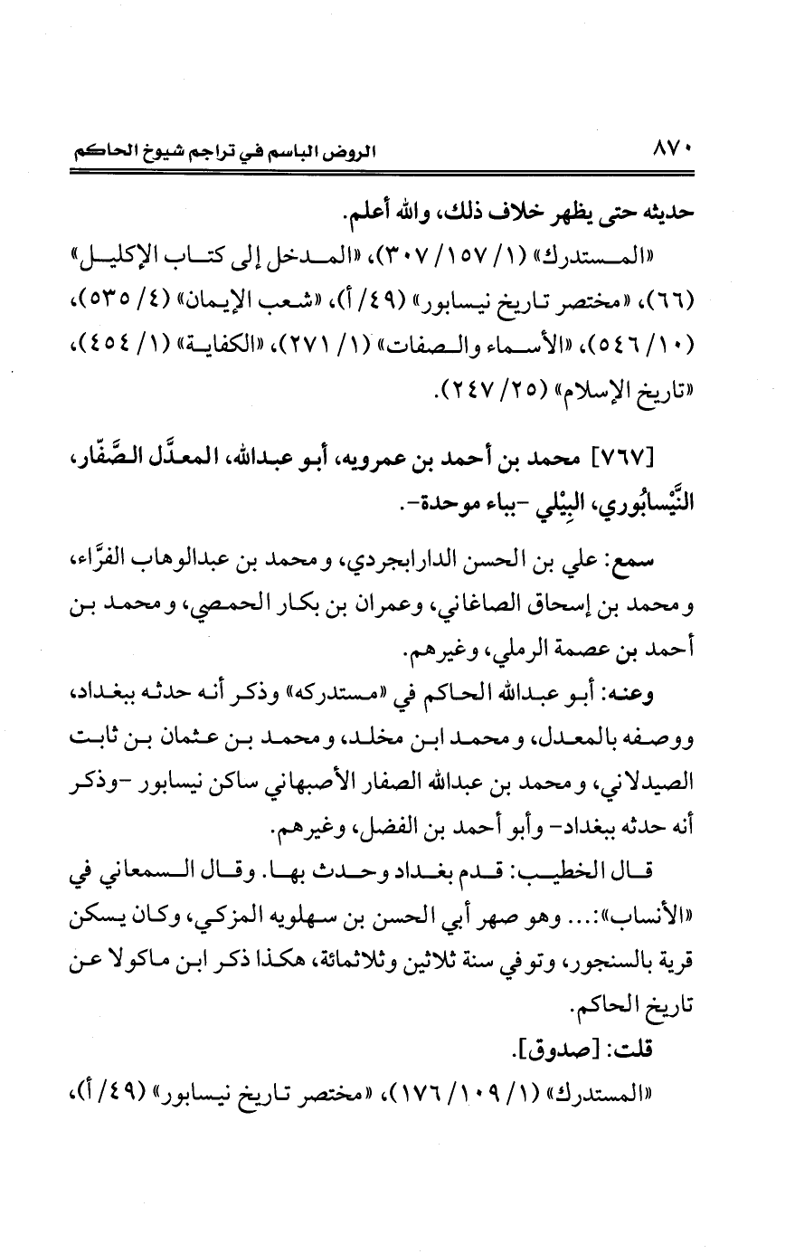 [767] محمَّد بن أحمد بن عمرويه، أبو عبد الله، المعدَّل الصَّفّار، النَّيْسابُوري، البِيْلي-بباء موحدة-.