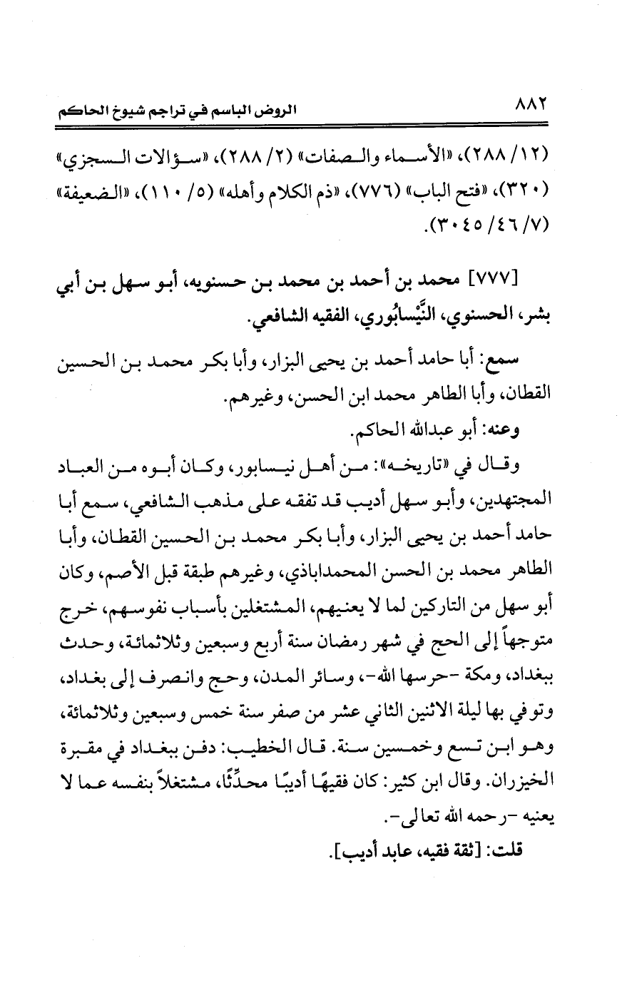 [777] محمَّد بن أحمد بن محمَّد بن حسنويه، أبو سهل بن أبي بشر، الحسنوي، النَّيْسابُوري، الفقيه الشافعي.