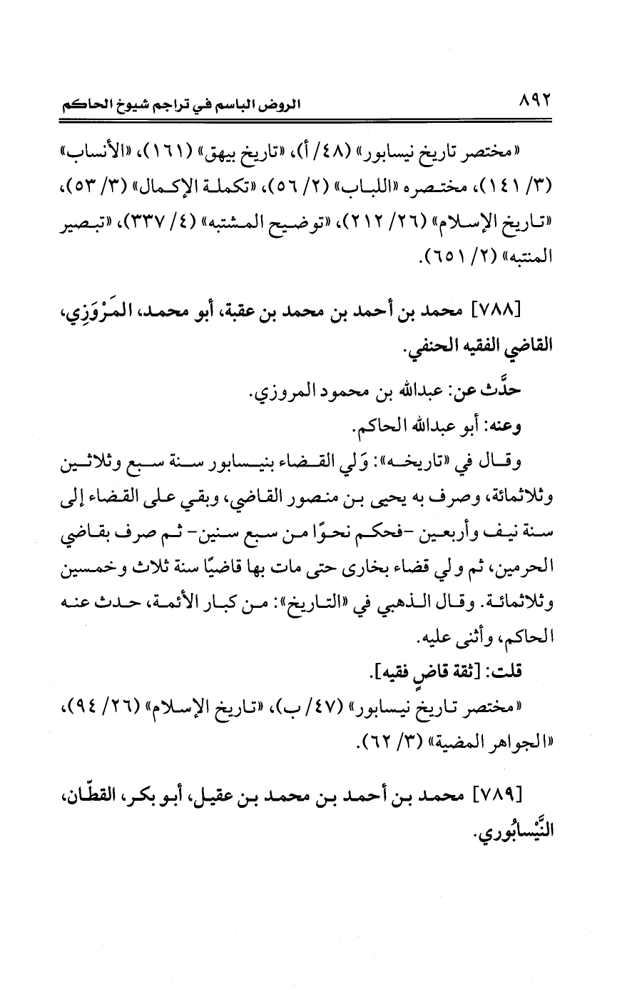 "مختصر تاريخ نيسابور" (47/ ب)، "تاريخ الإسلام" (26/ 94)، "الجواهر المضية" (3/ 62).