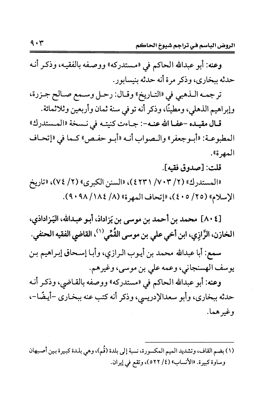 (¬1) بضم القاف، وتشديد الميم المكسورة، نسبة إلى بلدة (قُم)، وهي بلدة كبيرة بين أصبهان وساوة كبيرة. "الأنساب" (4/ 522)، وتقع في إيران.