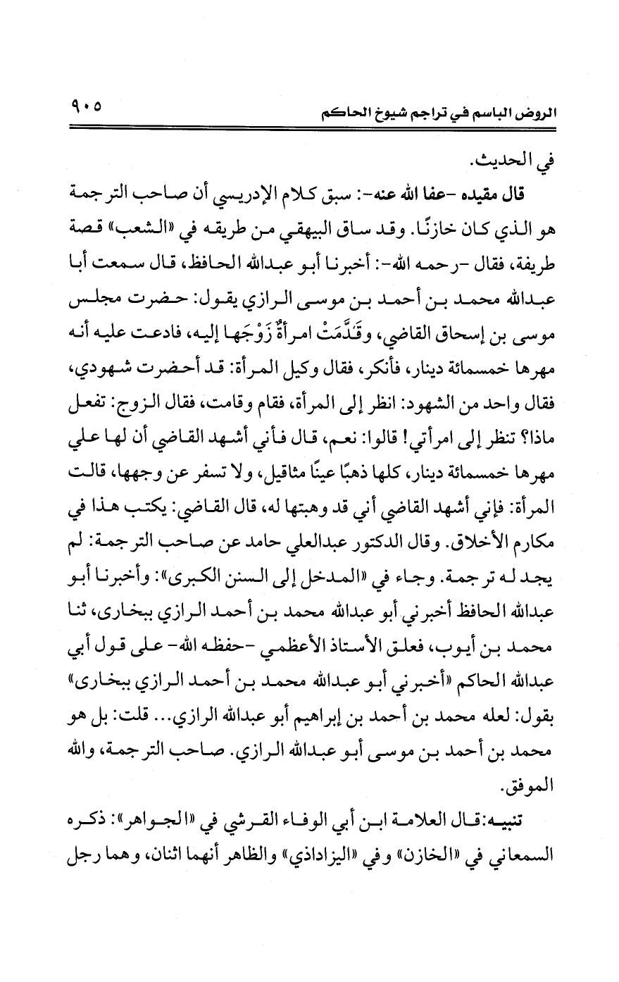 قال مقيده - عفا الله عنه -: سبق كلام الإدريسي أن صاحب الترجمة هو الذي كان خازنًا. وقد ساق البيهقي من طريقه في "الشعب" قصة طريفة، فقال - رحمه الله -: أخبرنا أبو عبد الله الحافظ، قال سمعت أبا عبد الله محمَّد بن أحمد بن موسى الرازي يقول: حضرت مجلس موسى بن إسحاق القاضي، وقَدَّمَتْ امرأةٌ زَوْجَها إليه، فادعت عليه أنه مهرها خمسمائة دينار، فأنكر، فقال وكيل المرأة: قد أحضرت شهودي، فقال واحد من الشهود: انظر إلى المرأة، فقام وقامت، فقال الزوج: تفعل ماذا؟ تنظر إلى امرأتي! قالوا: نعم، قال فأني أشهد القاضي أن لها علي مهرها خمسمائة دينار، كلها ذهبًا عينًا مثاقيل، ولا تسفر عن وجهها، قالت المرأة: فإني أشهد القاضي أني قد وهبتها له، قال القاضي: يكتب هذا في مكارم الأخلاق. وقال الدكتور عبد العلي حامد عن صاحب الترجمة: لم يجد له ترجمته. وجاء في "المدخل إلى السنن الكبرى": وأخبرنا أبو عبد الله الحافظ أخبرني أبو عبد الله محمَّد بن أحمد الرازي ببخارى، ثنا محمَّد بن أيوب، فعلق الأستاذ الأعظمي - حفظه الله - على قول أبي عبد الله الحاكم "أخبرني أبو عبد الله محمَّد بن أحمد الرازي ببخارى" بقول: لعله محمَّد بن أحمد بن إبراهيم أبو عبد الله الرازي ... قلت: بل هو محمَّد بن أحمد بن موسى أبو عبد الله الرازي. صاحب الترجمة، والله الموفق.