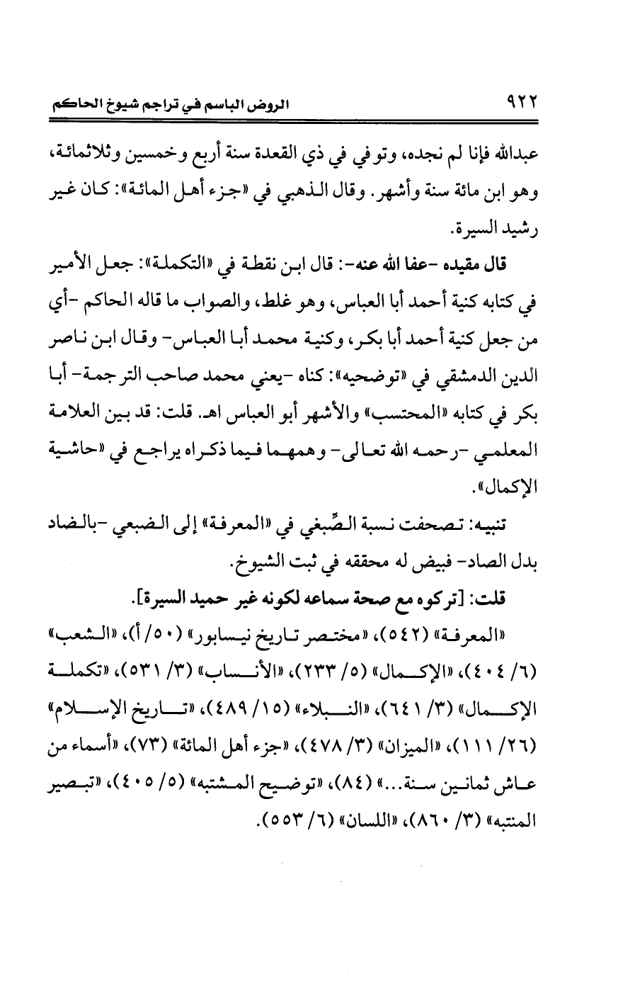 قال مقيده - عفا الله عنه -: قال ابن نقطة في "التكملة": جعل الأمير في كتابه كنية أحمد أبا العباس، وهو غلط، والصواب ما قاله الحاكم -أي من جعل كنية أحمد أبا بكر، وكنية محمَّد أبا العباس- وقال ابن ناصر الدين الدمشقي في "توضحيه": كناه -يعني محمَّد صاحب الترجمة- أبا بكر في كتابه "المحتسب" والأشهر أبو العباس اهـ. قلت: قد بين العلامة المعلمي - رحمه الله تعالى - وهمهما فيما ذكراه يراجع في "حاشية الإكمال".
