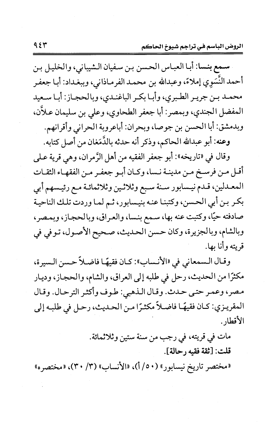 وقال في "تاريخه": أبو جعفر الفقيه من أهل الرَّمران، وهي قرية على أقل من فرسخ من مدينة نسا، وكان أبو جعفر من الفقهاء الثقات المعدلين، قدم نيسابور سنة سبع وثلاثين وثلاثمائة مع رئيسهم أبي بكر بن أبي الحسن، وكتبنا عنه بنيسابور، ثم لما وردت تلك الناحية صادفته حيًّا، وكتبت عنه بها، سمع بنسا، والعراق، وبالحجاز، وبمصر، وبالشام، وبالجزيرة، وكان حسن الحديث، صحيح الأصول، توفي في قريته وأنا بها.