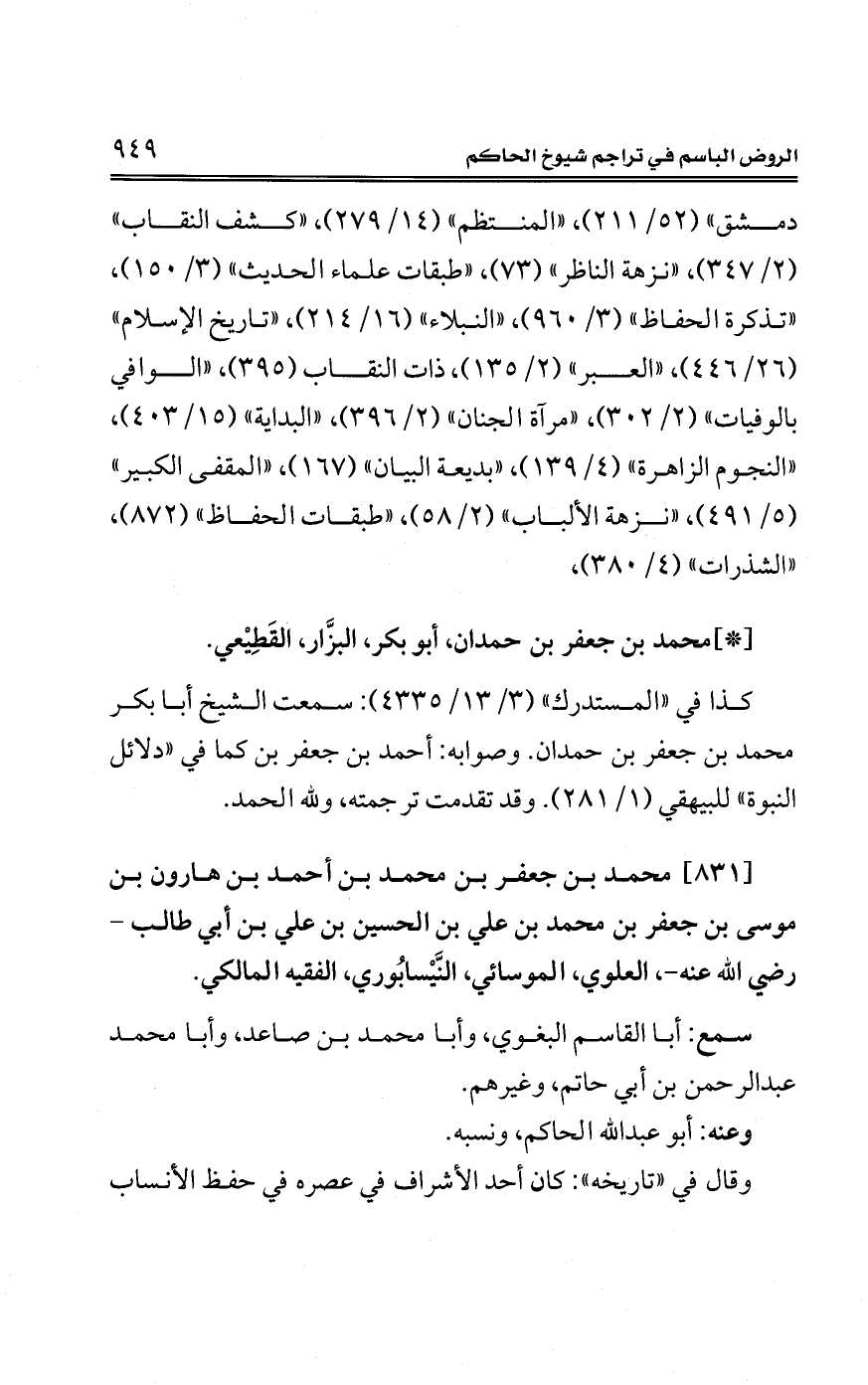 [831] محمَّد بن جعفر بن محمَّد بن أحمد بن هارون بن موسى بن جعفر بن محمَّد بن علي بن الحسين بن علي بن أبي طالب - رضي الله عنه -، العلوي، الموسائي، النَّيْسابُوري، الفقيه المالكي.