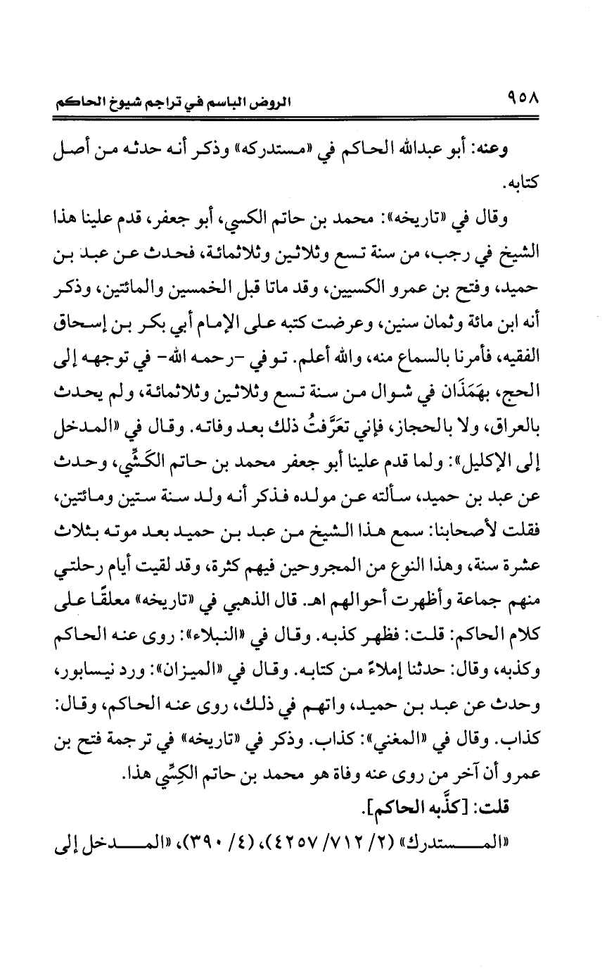 وقال في "تاريخه": محمَّد بن حاتم الكسي، أبو جعفر، قدم علينا هذا الشيخ في رجب، من سنة تسع وثلاثين وثلاثمائة، فحدث عن عبد بن حميد، وفتح بن عمرو الكسيين، وقد ماتا قبل الخمسين والمائتين، وذكر أنه ابن مائة وثمان سنين، وعرضت كتبه على الإِمام أبي بكر بن إسحاق الفقيه، فأمرنا بالسماع منه، والله أعلم. توفي -رحمه الله- في توجهه إلى الحج، بهَمَذَان في شوال من سنة تسع وثلاثين وثلاثمائة، ولم يحدث بالعراق، ولا بالحجاز، فإني تعَرَّفتُ ذلك بعد وفاته. وقال في "المدخل إلى الإكليل": ولما قدم علينا أبو جعفر محمَّد بن حاتم الكَشِّي، وحدث عن عبد بن حميد، سألته عن مولده فذكر أنه ولد سنة ستين ومائتين، فقلت لأصحابنا: سمع هذا الشيخ من عبد بن حميد بعد موته بثلاث عشرة سنة، وهذا النوع من المجروحين فيهم كثرة، وقد لقيت أيام رحلتي منهم جماعة وأظهرت أحوالهم اهـ. قال الذهبي في "تاريخه" معلقا على كلام الحاكم: قلت: فظهر كذبه. وقال في "النبلاء": روى عنه الحاكم وكذبه، وقال: حدثنا إملاءً من كتابه. وقال في "الميزان": ورد نيسابور، وحدث عن عبد بن حميد، واتهم في ذلك، روى عنه الحاكم، وقال: كذاب. وقال في "المغني": كذاب. وذكر في "تاريخه" في ترجمة فتح بن عمرو أن آخر من روى عنه وفاة هو محمَّد بن حاتم الكِسِّي هذا.