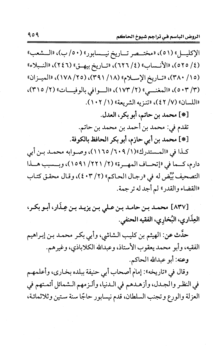 [837] محمَّد بن حامد بن علي بن يزيد بن عِذَار، أبو بكر، العِذَاري، البُخارِي، الفقيه الحنفي.