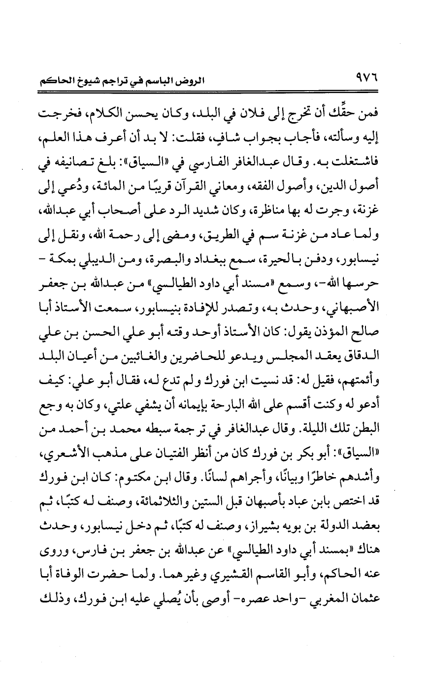 فمن حقِّك أن تخرج إلى فلان في البلد، وكان يحسن الكلام، فخرجت إليه وسألته، فأجاب بجواب شافٍ، فقلت: لا بد أن أعرف هذا العلم، فاشتغلت به. وقال عبد الغافر الفارسي في "السياق": بلغ تصانيفه في أصول الدين، وأصول الفقه، ومعاني القرآن قريبًا من المائة، ودُعي إلى غزنة، وجرت له بها مناظرة، وكان شديد الرد على أصحاب أبي عبد الله، ولما عاد من غزنة سم في الطريق، ومضى إلى رحمة الله، ونقل إلى نيسابور، ودفن بالحيرة، سمع ببغداد والبصرة، ومن الديبلي بمكة -حرسها الله-، وسمع "مسند أبي داود الطيالسي" من عبد الله بن جعفر الأصبهاني، وحدث به، وتصدر للإفادة بنيسابور، سمعت الأستاذ أبا صالح المؤذن يقول: كان الأستاذ أوحد وقته أبو علي الحسن بن علي الدقاق يعقد المجلس ويدعو للحاضرين والغائبين من أعيان البلد وأئمتهم، فقيل له: قد نسيت ابن فورك ولم تدع له، فقال أبو علي: كيف أدعو له وكنت أقسم على الله البارحة بإيمانه أن يشفي علتي، وكان به وجع البطن تلك الليلة. وقال عبد الغافر في ترجمته سبطه محمَّد بن أحمد من "السياق": أبو بكر بن فورك كان من انظر الفتيان على مذهب الأشعري، وأشدهم خاطرًا وبيانًا، وأجراهم لسانًا. وقال ابن مكتوم: كان ابن فورك قد اختص بابن عباد بأصبهان قبل الستين والثلاثمائة، وصنف له كتبًا، ثم بعضد الدولة بن بويه بشيراز، وصنف له كتبًا، ثم دخل نيسابور، وحدث هناك "بمسند أبي داود الطيالسي" عن عبد الله بن جعفر بن فارس، وروى عنه الحاكم، وأبو القاسم القشيري وغيرهما. ولما حضرت الوفاة أبا عثمان المغربي -واحد عصره- أوصى بأن يُصلي عليه ابن فورك، وذلك