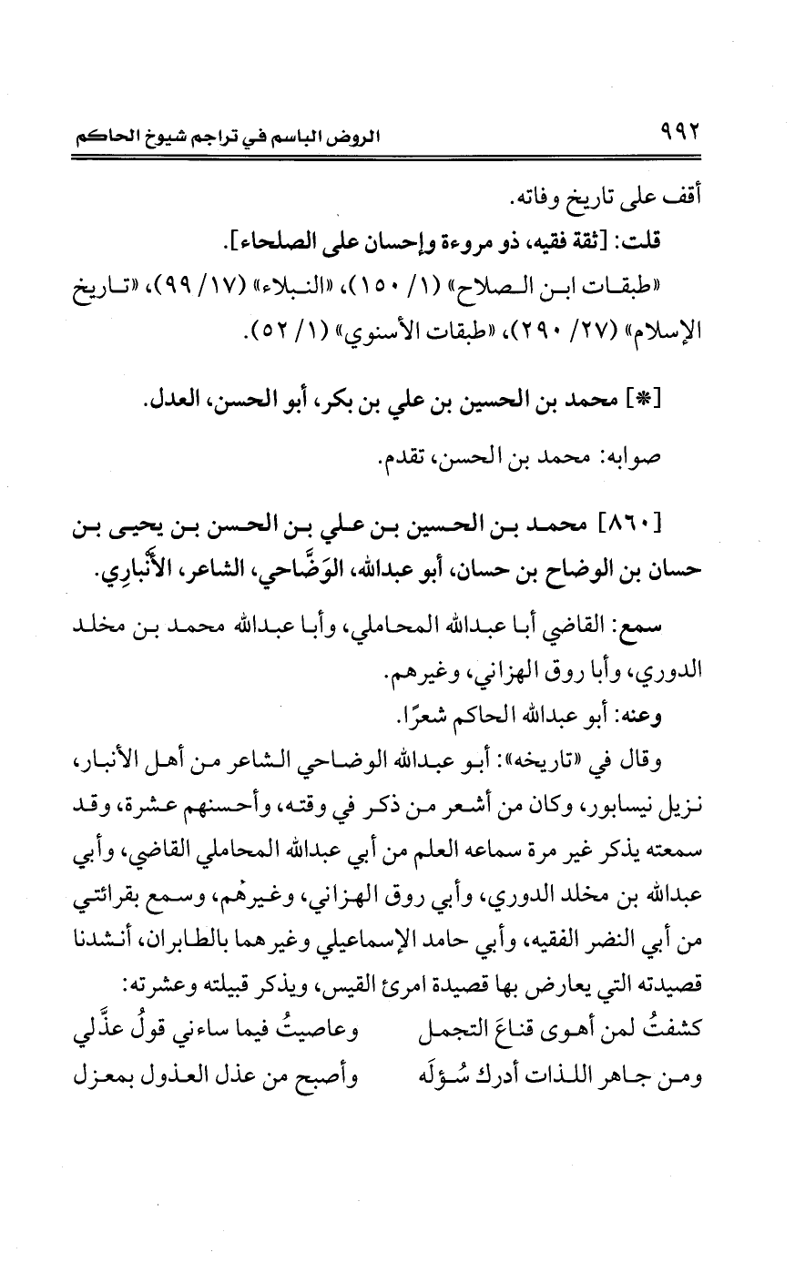 [860] محمَّد بن الحسين بن علي بن الحسن بن يحيى بن حسان بن الوضاح بن حسان، أبو عبد الله، الوَضَّاحي، الشاعر، الأَنْبارِي.