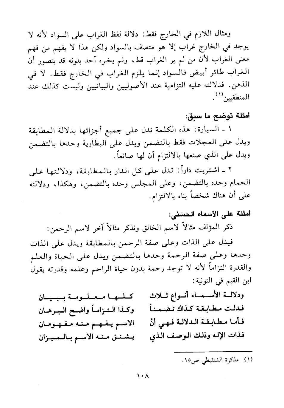 1 - السيارة: هذه الكلمة تدل على جميع أجزائها بدلالة المطابقة ويدل على العجلات فقط بالتضمن ويدل على البطارية وحدها بالتضمن ويدل على الذي صنعها بالالتزام أن لها صانعاً.