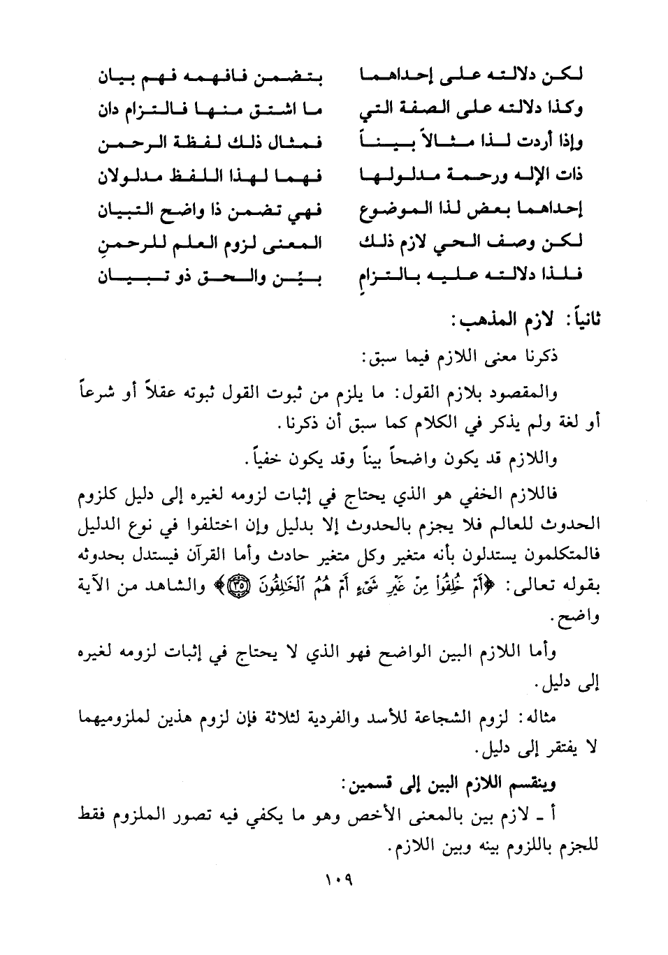 واللازم قد يكون واضحاً بيناً وقد يكون خفياً فاللازم الخفي هو الذي يحتاج في إثبات لزومه لغيره إلى دليل كلزوم الحدوث للعالم فلا يجزم بالحدوث إلا بدليل وإن اختلفوا في نوع الدليل فالمتكلمون يستدلون بأنه متغير وكل متغير حادث وأما القرآن فيستدل بحدوثه بقوله تعالى: {أم خلقوا من غير شيء أم هم الخالقون} والشاهد من الآية واضح.