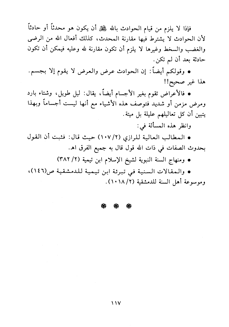 فإذا لا يلزم من قيام الحوادث بالله عز وجل أن يكون هو محدثاً أو حادثاً لأن الحوادث لا يشترط فيها مقارنة المحدث كذلك أفعال الله من الرضى والغضب والسخط وغيرها لا يلزم أن تكون مقارنة لله وعليه فيمكن أن تكون حادثة بعد أن لم تكن