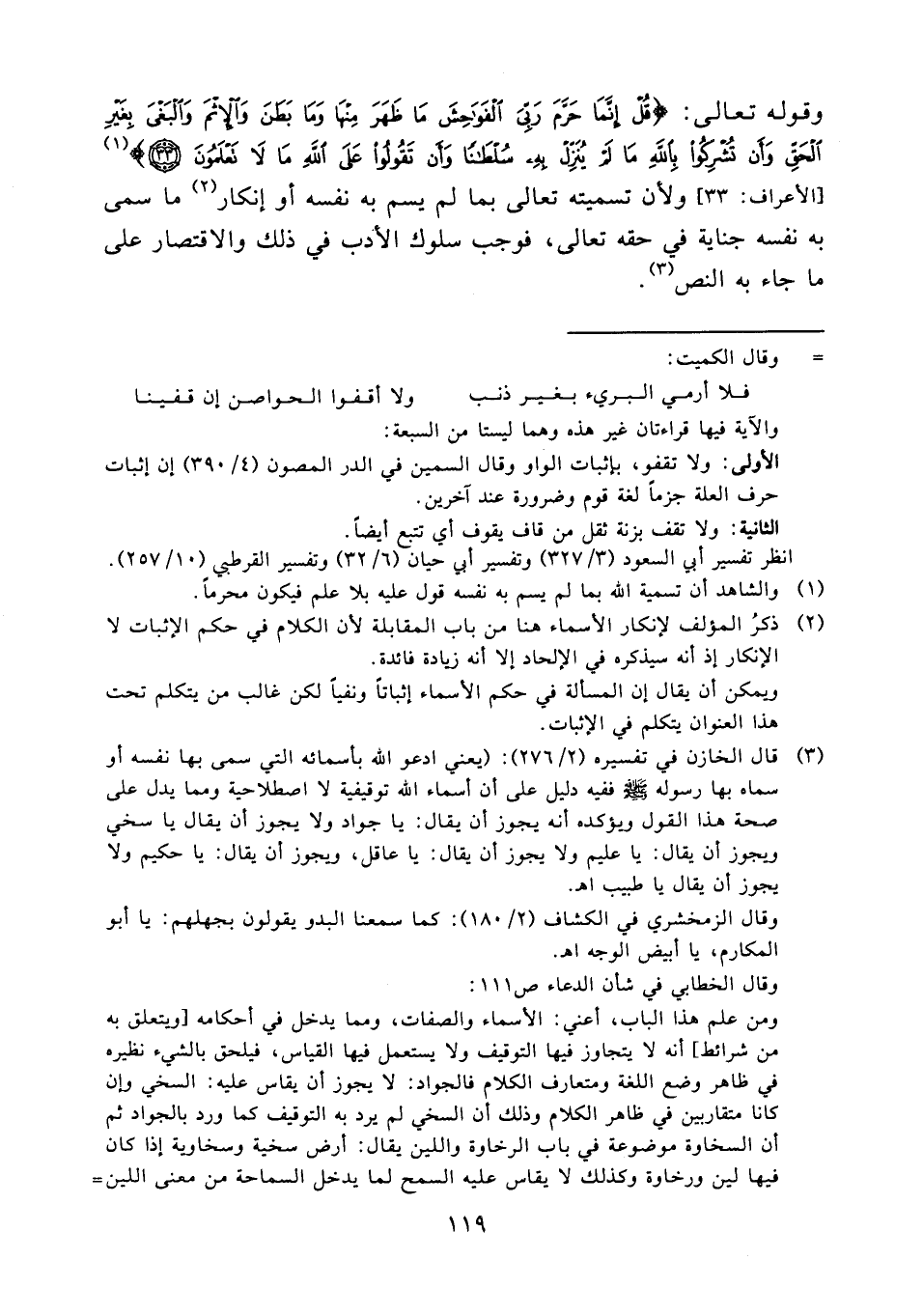 [الأعراف: 33] ولأن تسميته تعالى بما لم يسم به نفسه أو إنكار (¬2) ما سمى به نفسه جناية في حقه تعالى فوجب سلوك الأدب في ذلك والاقتصار على ما جاء به النص (¬3)