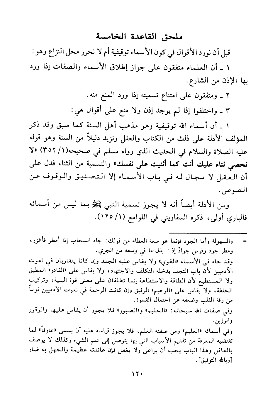 1 - أن أسماء الله توقيفية وهو مذهب أهل السنة كما سبق وقد ذكر المؤلف الأدلة على ذلك من الكتاب والعقل ونزيد دليلاً من السنة وهو قوله عليه الصلاة والسلام في الحديث الذي رواه مسلم في صحيحه (1/352) (لا نحصي ثناء عليك أنت كما أثنيت على نفسك) والتسمية من الثناء فدل على أن العقل لا مجال له في باب الأسماء إلا التصديق والوقوف عند النصوص.