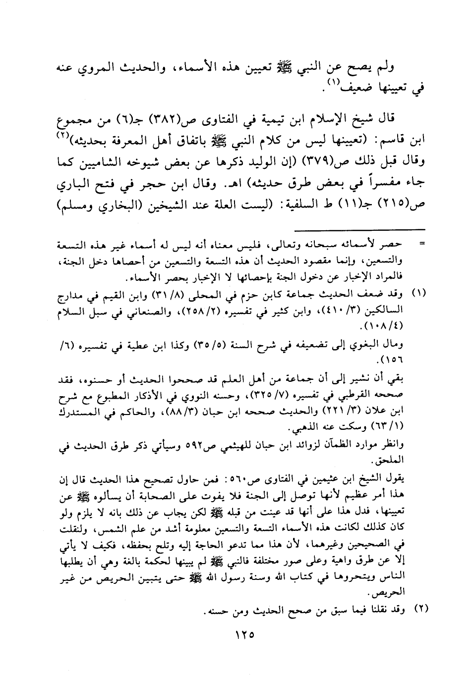 يقول الشيخ ابن عثيمين في الفتاوى ص 560: فمن حاول تصحيح هذا الحديث قال إن هذا أمر عظيم لأنها توصل إلى الجنة فلا يفوت على الصحابة أن يسألوه صلى الله عليه وسلم عن تعيينها، فدل هذا على أنها قد عينت من قبله صلى الله عليه وسلم لكن يجاب عن ذلك بأنه لا يلزم ولو كان كذلك لكانت هذه الأسماء التسعة والتسعين معلومة أشد من علم الشمس، ولنقلت في الصحيحين وغيرهما، لأن هذا مما تدعو الحاجة إليه وتلح بحفظه، فكيف لا يأتي إلا عن طرق واهية وعلى صور مختلفة فالنبي صلى الله عليه وسلم لم يبينها لحكمة بالغة وهي أن يطلبها الناس ويتحروها في كتاب الله وسنة رسول الله صلى الله عليه وسلم حتى يتبين الحريص من غير الحريص.