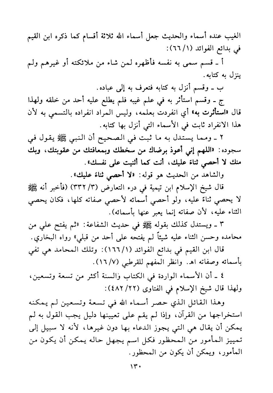 (أ) الحديث الذي استدل به المؤلف وهو أن الله استأثر في علم الغيب عنده أسماء والحديث جعل أسماء الله ثلاثة أقسام كما ذكره ابن القيم في بدائع الفوائد (1/66) :